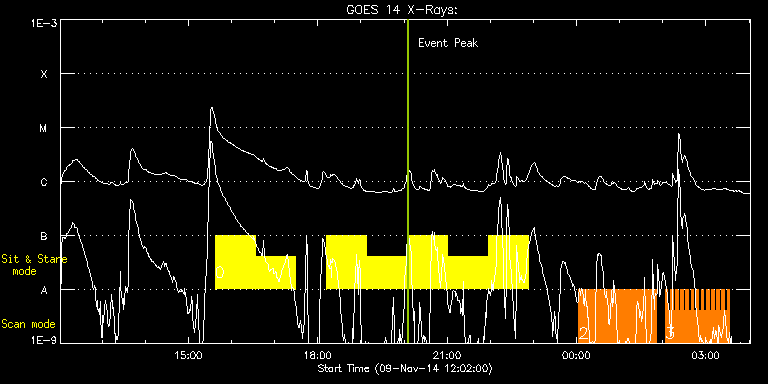 EIS Observation timeline overlay to GOES-Xray curve Code 1" 2" 40" 266" EIS Observations list for this event: STUDY ACRONYM ID DATE OBSERVED DESCRIPTION NOAA# TARGET 0 Flare266_Hunter02 | 43735 | 2014/11/09 15:37:02 | Major Flare Watch observation | 2205 | Flare TIMELINE ID DATE OBSERVED FITS FILE XCEN (+W/-E) YCEN (+N/-S) DUR ----------------------------------------------------------------------------------------------------------------- 43735 | 2014/11/09 15:37:02.000 | eis_l0_20141109_153702.fits.gz | -322.83 | 188.29 | 55m50s 43735 | 2014/11/09 16:33:18.000 | eis_l0_20141109_163318.fits.gz | -314.56 | 188.29 | 55m50s 1 Flare266_Hunter02 | 43736 | 2014/11/09 18:12:10 | Major Flare Watch observation | 2205 | Flare TIMELINE ID DATE OBSERVED FITS FILE XCEN (+W/-E) YCEN (+N/-S) DUR ----------------------------------------------------------------------------------------------------------------- 43736 | 2014/11/09 18:12:10.000 | eis_l0_20141109_181210.fits.gz | -299.88 | 188.22 | 55m50s 43736 | 2014/11/09 19:08:27.000 | eis_l0_20141109_190827.fits.gz | -291.54 | 188.06 | 55m49s 43736 | 2014/11/09 20:04:43.000 | eis_l0_20141109_200443.fits.gz | -283.12 | 188.22 | 55m49s 43736 | 2014/11/09 21:00:58.000 | eis_l0_20141109_210058.fits.gz | -274.78 | 188.06 | 55m49s 43736 | 2014/11/09 21:57:14.000 | eis_l0_20141109_215714.fits.gz | -266.43 | 188.14 | 55m49s 2 Hot_loop_osci_1 | 43701 | 2014/11/10 00:03:20 | Chromospheric dynamics in active regio | | Active Region TIMELINE ID DATE OBSERVED FITS FILE XCEN (+W/-E) YCEN (+N/-S) DUR ----------------------------------------------------------------------------------------------------------------- 43701 | 2014/11/10 00:03:20.000 | eis_l0_20141110_000320.fits.gz | -157.56 | 170.07 | 1m5s 43701 | 2014/11/10 00:04:28.000 | eis_l0_20141110_000428.fits.gz | -157.33 | 170.15 | 1m5s 43701 | 2014/11/10 00:05:36.000 | eis_l0_20141110_000536.fits.gz | -157.25 | 170.15 | 1m5s 43701 | 2014/11/10 00:06:44.000 | eis_l0_20141110_000644.fits.gz | -157.02 | 170.07 | 1m5s 43701 | 2014/11/10 00:07:52.000 | eis_l0_20141110_000752.fits.gz | -156.87 | 170.30 | 1m4s 43701 | 2014/11/10 00:08:59.000 | eis_l0_20141110_000859.fits.gz | -156.71 | 170.07 | 1m6s 43701 | 2014/11/10 00:10:07.000 | eis_l0_20141110_001007.fits.gz | -156.48 | 169.99 | 1m5s 43701 | 2014/11/10 00:11:15.000 | eis_l0_20141110_001115.fits.gz | -156.40 | 170.23 | 1m6s 43701 | 2014/11/10 00:12:23.000 | eis_l0_20141110_001223.fits.gz | -156.17 | 170.15 | 1m5s 43701 | 2014/11/10 00:13:31.000 | eis_l0_20141110_001331.fits.gz | -156.02 | 170.15 | 1m5s 43701 | 2014/11/10 00:14:39.000 | eis_l0_20141110_001439.fits.gz | -155.86 | 170.23 | 1m5s 43701 | 2014/11/10 00:15:47.000 | eis_l0_20141110_001547.fits.gz | -155.71 | 170.15 | 1m5s 43701 | 2014/11/10 00:16:55.000 | eis_l0_20141110_001655.fits.gz | -155.48 | 170.15 | 1m5s 43701 | 2014/11/10 00:18:03.000 | eis_l0_20141110_001803.fits.gz | -155.32 | 170.15 | 1m5s 43701 | 2014/11/10 00:19:10.000 | eis_l0_20141110_001910.fits.gz | -155.24 | 170.15 | 1m5s 43701 | 2014/11/10 00:20:18.000 | eis_l0_20141110_002018.fits.gz | -155.01 | 170.23 | 1m5s 43701 | 2014/11/10 00:21:26.000 | eis_l0_20141110_002126.fits.gz | -154.78 | 170.23 | 1m5s 43701 | 2014/11/10 00:22:34.000 | eis_l0_20141110_002234.fits.gz | -154.63 | 170.15 | 1m5s 43701 | 2014/11/10 00:23:41.000 | eis_l0_20141110_002341.fits.gz | -154.55 | 170.23 | 1m6s 43701 | 2014/11/10 00:24:49.000 | eis_l0_20141110_002449.fits.gz | -154.32 | 170.30 | 1m5s 43701 | 2014/11/10 00:25:57.000 | eis_l0_20141110_002557.fits.gz | -154.09 | 170.07 | 1m5s 43701 | 2014/11/10 00:27:05.000 | eis_l0_20141110_002705.fits.gz | -153.93 | 170.23 | 1m5s 43701 | 2014/11/10 00:28:13.000 | eis_l0_20141110_002813.fits.gz | -153.78 | 170.23 | 1m5s 43701 | 2014/11/10 00:29:20.000 | eis_l0_20141110_002920.fits.gz | -153.62 | 170.15 | 1m6s 43701 | 2014/11/10 00:30:28.000 | eis_l0_20141110_003028.fits.gz | -153.47 | 170.30 | 1m5s 43701 | 2014/11/10 00:31:36.000 | eis_l0_20141110_003136.fits.gz | -153.31 | 170.23 | 1m6s 43701 | 2014/11/10 00:32:44.000 | eis_l0_20141110_003244.fits.gz | -153.16 | 170.15 | 1m5s 43701 | 2014/11/10 00:33:52.000 | eis_l0_20141110_003352.fits.gz | -152.93 | 170.15 | 1m5s 43701 | 2014/11/10 00:35:00.000 | eis_l0_20141110_003500.fits.gz | -152.77 | 170.30 | 1m5s 43701 | 2014/11/10 00:36:08.000 | eis_l0_20141110_003608.fits.gz | -152.62 | 170.30 | 1m5s 43701 | 2014/11/10 00:37:16.000 | eis_l0_20141110_003716.fits.gz | -152.46 | 170.15 | 1m5s 43701 | 2014/11/10 00:38:24.000 | eis_l0_20141110_003824.fits.gz | -152.31 | 170.30 | 1m5s 43701 | 2014/11/10 00:39:32.000 | eis_l0_20141110_003932.fits.gz | -152.08 | 170.30 | 1m5s 43701 | 2014/11/10 00:40:40.000 | eis_l0_20141110_004040.fits.gz | -151.92 | 170.23 | 1m5s 43701 | 2014/11/10 00:41:47.000 | eis_l0_20141110_004147.fits.gz | -151.77 | 170.15 | 1m5s 43701 | 2014/11/10 00:42:55.000 | eis_l0_20141110_004255.fits.gz | -151.61 | 170.23 | 1m5s 43701 | 2014/11/10 00:44:03.000 | eis_l0_20141110_004403.fits.gz | -151.46 | 170.23 | 1m5s 43701 | 2014/11/10 00:45:11.000 | eis_l0_20141110_004511.fits.gz | -151.30 | 170.30 | 1m5s 43701 | 2014/11/10 00:46:18.000 | eis_l0_20141110_004618.fits.gz | -151.07 | 170.46 | 1m6s 43701 | 2014/11/10 00:47:26.000 | eis_l0_20141110_004726.fits.gz | -150.92 | 170.30 | 1m5s 43701 | 2014/11/10 00:48:34.000 | eis_l0_20141110_004834.fits.gz | -150.76 | 170.23 | 1m5s 43701 | 2014/11/10 00:49:42.000 | eis_l0_20141110_004942.fits.gz | -150.61 | 170.30 | 1m5s 43701 | 2014/11/10 00:50:50.000 | eis_l0_20141110_005050.fits.gz | -150.38 | 170.30 | 1m5s 43701 | 2014/11/10 00:51:58.000 | eis_l0_20141110_005158.fits.gz | -150.22 | 170.38 | 1m5s 43701 | 2014/11/10 00:53:05.000 | eis_l0_20141110_005305.fits.gz | -150.07 | 170.46 | 1m5s 43701 | 2014/11/10 00:54:13.000 | eis_l0_20141110_005413.fits.gz | -149.91 | 170.30 | 1m5s 43701 | 2014/11/10 00:55:21.000 | eis_l0_20141110_005521.fits.gz | -149.68 | 170.23 | 1m5s 43701 | 2014/11/10 00:56:29.000 | eis_l0_20141110_005629.fits.gz 
