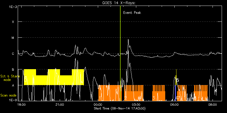 EIS Observation timeline overlay to GOES-Xray curve Code 1" 2" 40" 266" EIS Observations list for this event: STUDY ACRONYM ID DATE OBSERVED DESCRIPTION NOAA# TARGET 0 Flare266_Hunter02 | 43736 | 2014/11/09 18:12:10 | Major Flare Watch observation | 2205 | Flare TIMELINE ID DATE OBSERVED FITS FILE XCEN (+W/-E) YCEN (+N/-S) DUR ----------------------------------------------------------------------------------------------------------------- 43736 | 2014/11/09 18:12:10.000 | eis_l0_20141109_181210.fits.gz | -299.88 | 188.22 | 55m50s 43736 | 2014/11/09 19:08:27.000 | eis_l0_20141109_190827.fits.gz | -291.54 | 188.06 | 55m49s 43736 | 2014/11/09 20:04:43.000 | eis_l0_20141109_200443.fits.gz | -283.12 | 188.22 | 55m49s 43736 | 2014/11/09 21:00:58.000 | eis_l0_20141109_210058.fits.gz | -274.78 | 188.06 | 55m49s 43736 | 2014/11/09 21:57:14.000 | eis_l0_20141109_215714.fits.gz | -266.43 | 188.14 | 55m49s 1 Hot_loop_osci_1 | 43701 | 2014/11/10 00:03:20 | Chromospheric dynamics in active regio | | Active Region TIMELINE ID DATE OBSERVED FITS FILE XCEN (+W/-E) YCEN (+N/-S) DUR ----------------------------------------------------------------------------------------------------------------- 43701 | 2014/11/10 00:03:20.000 | eis_l0_20141110_000320.fits.gz | -157.56 | 170.07 | 1m5s 43701 | 2014/11/10 00:04:28.000 | eis_l0_20141110_000428.fits.gz | -157.33 | 170.15 | 1m5s 43701 | 2014/11/10 00:05:36.000 | eis_l0_20141110_000536.fits.gz | -157.25 | 170.15 | 1m5s 43701 | 2014/11/10 00:06:44.000 | eis_l0_20141110_000644.fits.gz | -157.02 | 170.07 | 1m5s 43701 | 2014/11/10 00:07:52.000 | eis_l0_20141110_000752.fits.gz | -156.87 | 170.30 | 1m4s 43701 | 2014/11/10 00:08:59.000 | eis_l0_20141110_000859.fits.gz | -156.71 | 170.07 | 1m6s 43701 | 2014/11/10 00:10:07.000 | eis_l0_20141110_001007.fits.gz | -156.48 | 169.99 | 1m5s 43701 | 2014/11/10 00:11:15.000 | eis_l0_20141110_001115.fits.gz | -156.40 | 170.23 | 1m6s 43701 | 2014/11/10 00:12:23.000 | eis_l0_20141110_001223.fits.gz | -156.17 | 170.15 | 1m5s 43701 | 2014/11/10 00:13:31.000 | eis_l0_20141110_001331.fits.gz | -156.02 | 170.15 | 1m5s 43701 | 2014/11/10 00:14:39.000 | eis_l0_20141110_001439.fits.gz | -155.86 | 170.23 | 1m5s 43701 | 2014/11/10 00:15:47.000 | eis_l0_20141110_001547.fits.gz | -155.71 | 170.15 | 1m5s 43701 | 2014/11/10 00:16:55.000 | eis_l0_20141110_001655.fits.gz | -155.48 | 170.15 | 1m5s 43701 | 2014/11/10 00:18:03.000 | eis_l0_20141110_001803.fits.gz | -155.32 | 170.15 | 1m5s 43701 | 2014/11/10 00:19:10.000 | eis_l0_20141110_001910.fits.gz | -155.24 | 170.15 | 1m5s 43701 | 2014/11/10 00:20:18.000 | eis_l0_20141110_002018.fits.gz | -155.01 | 170.23 | 1m5s 43701 | 2014/11/10 00:21:26.000 | eis_l0_20141110_002126.fits.gz | -154.78 | 170.23 | 1m5s 43701 | 2014/11/10 00:22:34.000 | eis_l0_20141110_002234.fits.gz | -154.63 | 170.15 | 1m5s 43701 | 2014/11/10 00:23:41.000 | eis_l0_20141110_002341.fits.gz | -154.55 | 170.23 | 1m6s 43701 | 2014/11/10 00:24:49.000 | eis_l0_20141110_002449.fits.gz | -154.32 | 170.30 | 1m5s 43701 | 2014/11/10 00:25:57.000 | eis_l0_20141110_002557.fits.gz | -154.09 | 170.07 | 1m5s 43701 | 2014/11/10 00:27:05.000 | eis_l0_20141110_002705.fits.gz | -153.93 | 170.23 | 1m5s 43701 | 2014/11/10 00:28:13.000 | eis_l0_20141110_002813.fits.gz | -153.78 | 170.23 | 1m5s 43701 | 2014/11/10 00:29:20.000 | eis_l0_20141110_002920.fits.gz | -153.62 | 170.15 | 1m6s 43701 | 2014/11/10 00:30:28.000 | eis_l0_20141110_003028.fits.gz | -153.47 | 170.30 | 1m5s 43701 | 2014/11/10 00:31:36.000 | eis_l0_20141110_003136.fits.gz | -153.31 | 170.23 | 1m6s 43701 | 2014/11/10 00:32:44.000 | eis_l0_20141110_003244.fits.gz | -153.16 | 170.15 | 1m5s 43701 | 2014/11/10 00:33:52.000 | eis_l0_20141110_003352.fits.gz | -152.93 | 170.15 | 1m5s 43701 | 2014/11/10 00:35:00.000 | eis_l0_20141110_003500.fits.gz | -152.77 | 170.30 | 1m5s 43701 | 2014/11/10 00:36:08.000 | eis_l0_20141110_003608.fits.gz | -152.62 | 170.30 | 1m5s 43701 | 2014/11/10 00:37:16.000 | eis_l0_20141110_003716.fits.gz | -152.46 | 170.15 | 1m5s 43701 | 2014/11/10 00:38:24.000 | eis_l0_20141110_003824.fits.gz | -152.31 | 170.30 | 1m5s 43701 | 2014/11/10 00:39:32.000 | eis_l0_20141110_003932.fits.gz | -152.08 | 170.30 | 1m5s 43701 | 2014/11/10 00:40:40.000 | eis_l0_20141110_004040.fits.gz | -151.92 | 170.23 | 1m5s 43701 | 2014/11/10 00:41:47.000 | eis_l0_20141110_004147.fits.gz | -151.77 | 170.15 | 1m5s 43701 | 2014/11/10 00:42:55.000 | eis_l0_20141110_004255.fits.gz | -151.61 | 170.23 | 1m5s 43701 | 2014/11/10 00:44:03.000 | eis_l0_20141110_004403.fits.gz | -151.46 | 170.23 | 1m5s 43701 | 2014/11/10 00:45:11.000 | eis_l0_20141110_004511.fits.gz | -151.30 | 170.30 | 1m5s 43701 | 2014/11/10 00:46:18.000 | eis_l0_20141110_004618.fits.gz | -151.07 | 170.46 | 1m6s 43701 | 2014/11/10 00:47:26.000 | eis_l0_20141110_004726.fits.gz | -150.92 | 170.30 | 1m5s 43701 | 2014/11/10 00:48:34.000 | eis_l0_20141110_004834.fits.gz | -150.76 | 170.23 | 1m5s 43701 | 2014/11/10 00:49:42.000 | eis_l0_20141110_004942.fits.gz | -150.61 | 170.30 | 1m5s 43701 | 2014/11/10 00:50:50.000 | eis_l0_20141110_005050.fits.gz | -150.38 | 170.30 | 1m5s 43701 | 2014/11/10 00:51:58.000 | eis_l0_20141110_005158.fits.gz | -150.22 | 170.38 | 1m5s 43701 | 2014/11/10 00:53:05.000 | eis_l0_20141110_005305.fits.gz | -150.07 | 170.46 | 1m5s 43701 | 2014/11/10 00:54:13.000 | eis_l0_20141110_005413.fits.gz | -149.91 | 170.30 | 1m5s 43701 | 2014/11/10 00:55:21.000 | eis_l0_20141110_005521.fits.gz | -149.68 | 170.23 | 1m5s 43701 | 2014/11/10 00:56:29.000 | eis_l0_20141110_005629.fits.gz | -149.53 | 170.23 | 1m5s 43701 | 2014/11/10 00:57:37.000 | eis_l0_20141110_005737.fits.gz | -149.37 | 170.30 | 1m5s 43701 | 2014/11/10 00:58:45.000 | eis_l0_20141110_005845.fits.gz | -149.22 | 170.15 | 1m5s 43701 | 2014/11/10 00:59:53.000 | eis_l0_20141110_005953.fits.gz | -149.06 | 170.23 | 1m5s 43701 | 2014/11/10 01:01:00.000 | eis_l0_20141110_010100.fits.gz | -148.83 | 170.30 | 1m6s 43701 | 2014/11/10 01:02:08.000 | eis_l0_20141110_010208.fits.gz | -148.7