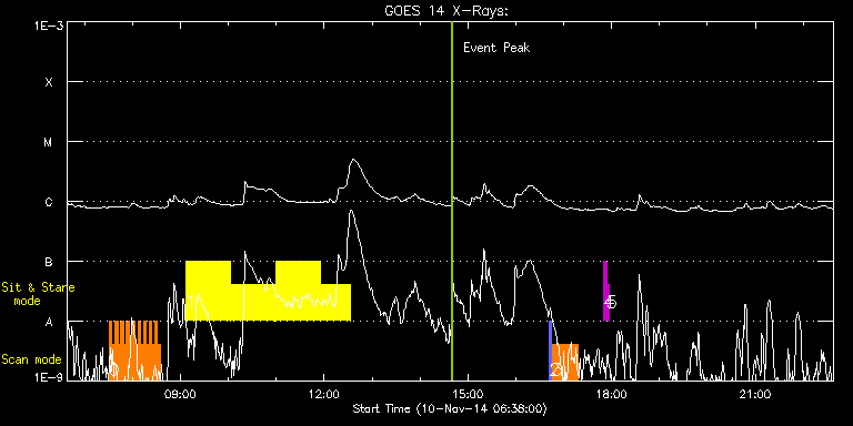 EIS Observation timeline overlay to GOES-Xray curve Code 1" 2" 40" 266" EIS Observations list for this event: STUDY ACRONYM ID DATE OBSERVED DESCRIPTION NOAA# TARGET 0 HH_Flare_raster_v6 | 43715 | 2014/11/10 07:30:39 | Major Flare Watch observation | 2205 | Flare TIMELINE ID DATE OBSERVED FITS FILE XCEN (+W/-E) YCEN (+N/-S) DUR ----------------------------------------------------------------------------------------------------------------- 43715 | 2014/11/10 07:30:39.000 | eis_l0_20141110_073039.fits.gz | -64.75 | 186.45 | 3m31s 43715 | 2014/11/10 07:34:13.000 | eis_l0_20141110_073413.fits.gz | -64.13 | 186.60 | 3m32s 43715 | 2014/11/10 07:37:48.000 | eis_l0_20141110_073748.fits.gz | -63.74 | 186.52 | 3m31s 43715 | 2014/11/10 07:41:22.000 | eis_l0_20141110_074122.fits.gz | -63.12 | 186.37 | 3m31s 43715 | 2014/11/10 07:44:56.000 | eis_l0_20141110_074456.fits.gz | -62.66 | 186.52 | 3m31s 43715 | 2014/11/10 07:48:30.000 | eis_l0_20141110_074830.fits.gz | -62.04 | 186.45 | 3m32s 43715 | 2014/11/10 07:52:04.000 | eis_l0_20141110_075204.fits.gz | -61.50 | 186.52 | 3m31s 43715 | 2014/11/10 07:55:38.000 | eis_l0_20141110_075538.fits.gz | -60.96 | 186.37 | 3m31s 43715 | 2014/11/10 07:59:12.000 | eis_l0_20141110_075912.fits.gz | -60.50 | 186.45 | 3m32s 43715 | 2014/11/10 08:02:47.000 | eis_l0_20141110_080247.fits.gz | -59.88 | 186.45 | 3m31s 43715 | 2014/11/10 08:06:21.000 | eis_l0_20141110_080621.fits.gz | -59.34 | 186.29 | 3m31s 43715 | 2014/11/10 08:09:55.000 | eis_l0_20141110_080955.fits.gz | -58.87 | 186.52 | 3m32s 43715 | 2014/11/10 08:13:29.000 | eis_l0_20141110_081329.fits.gz | -58.33 | 186.22 | 3m32s 43715 | 2014/11/10 08:17:04.000 | eis_l0_20141110_081704.fits.gz | -57.72 | 186.29 | 3m31s 43715 | 2014/11/10 08:20:37.000 | eis_l0_20141110_082037.fits.gz | -57.18 | 186.37 | 3m32s 43715 | 2014/11/10 08:24:12.000 | eis_l0_20141110_082412.fits.gz | -56.63 | 186.37 | 3m31s 43715 | 2014/11/10 08:27:46.000 | eis_l0_20141110_082746.fits.gz | -56.09 | 186.37 | 3m31s 43715 | 2014/11/10 08:31:19.000 | eis_l0_20141110_083119.fits.gz | -55.55 | 186.45 | 3m31s 1 Flare266_Hunter02 | 43721 | 2014/11/10 09:06:32 | Major Flare Watch observation | 2205 | Flare TIMELINE ID DATE OBSERVED FITS FILE XCEN (+W/-E) YCEN (+N/-S) DUR ----------------------------------------------------------------------------------------------------------------- 43721 | 2014/11/10 09:06:32.000 | eis_l0_20141110_090632.fits.gz | -166.09 | 188.52 | 55m49s 43721 | 2014/11/10 10:02:47.000 | eis_l0_20141110_100247.fits.gz | -157.59 | 188.45 | 55m51s 43721 | 2014/11/10 10:59:04.000 | eis_l0_20141110_105904.fits.gz | -149.25 | 188.68 | 55m49s 43721 | 2014/11/10 11:55:20.000 | eis_l0_20141110_115520.fits.gz | -140.68 | 188.76 | 37m25s 2 PRY_slot_context_v3 | 43719 | 2014/11/10 16:42:20 | Spectral atlas | 2205 | Active Region TIMELINE ID DATE OBSERVED FITS FILE XCEN (+W/-E) YCEN (+N/-S) DUR ----------------------------------------------------------------------------------------------------------------- 43719 | 2014/11/10 16:42:20.000 | eis_l0_20141110_164220.fits.gz | 19.93 | 189.07 | 2m57s 3 Atlas_30 | 43720 | 2014/11/10 16:45:42 | Spectral atlas | | Quiet Sun TIMELINE ID DATE OBSERVED FITS FILE XCEN (+W/-E) YCEN (+N/-S) DUR ----------------------------------------------------------------------------------------------------------------- 43720 | 2014/11/10 16:45:42.000 | eis_l0_20141110_164542.fits.gz | 35.06 | 188.91 | 31m39s 4 regcal071 | 43717 | 2014/11/10 17:50:12 | Dark exposures, CCD bottom rows (100s | | Engineering TIMELINE ID DATE OBSERVED FITS FILE XCEN (+W/-E) YCEN (+N/-S) DUR ----------------------------------------------------------------------------------------------------------------- 43717 | 2014/11/10 17:50:12.000 | eis_l0_20141110_175012.fits.gz | 59.86 | -115.70 | 3m22s 5 regcal072 | 43718 | 2014/11/10 17:54:00 | Dark exposures, top CCD rows (100s exp | | Engineering TIMELINE ID DATE OBSERVED FITS FILE XCEN (+W/-E) YCEN (+N/-S) DUR ----------------------------------------------------------------------------------------------------------------- 43718 | 2014/11/10 17:54:00.000 | eis_l0_20141110_175400.fits.gz | 60.40 | 395.30 | 3m22s : Check study information : Download file : View thumbnails For this event, also check for: