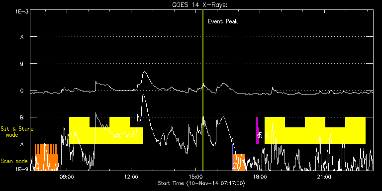 EIS Observation timeline overlay to GOES-Xray curve Code 1" 2" 40" 266" EIS Observations list for this event: STUDY ACRONYM ID DATE OBSERVED DESCRIPTION NOAA# TARGET 0 HH_Flare_raster_v6 | 43715 | 2014/11/10 07:30:39 | Major Flare Watch observation | 2205 | Flare TIMELINE ID DATE OBSERVED FITS FILE XCEN (+W/-E) YCEN (+N/-S) DUR ----------------------------------------------------------------------------------------------------------------- 43715 | 2014/11/10 07:30:39.000 | eis_l0_20141110_073039.fits.gz | -64.75 | 186.45 | 3m31s 43715 | 2014/11/10 07:34:13.000 | eis_l0_20141110_073413.fits.gz | -64.13 | 186.60 | 3m32s 43715 | 2014/11/10 07:37:48.000 | eis_l0_20141110_073748.fits.gz | -63.74 | 186.52 | 3m31s 43715 | 2014/11/10 07:41:22.000 | eis_l0_20141110_074122.fits.gz | -63.12 | 186.37 | 3m31s 43715 | 2014/11/10 07:44:56.000 | eis_l0_20141110_074456.fits.gz | -62.66 | 186.52 | 3m31s 43715 | 2014/11/10 07:48:30.000 | eis_l0_20141110_074830.fits.gz | -62.04 | 186.45 | 3m32s 43715 | 2014/11/10 07:52:04.000 | eis_l0_20141110_075204.fits.gz | -61.50 | 186.52 | 3m31s 43715 | 2014/11/10 07:55:38.000 | eis_l0_20141110_075538.fits.gz | -60.96 | 186.37 | 3m31s 43715 | 2014/11/10 07:59:12.000 | eis_l0_20141110_075912.fits.gz | -60.50 | 186.45 | 3m32s 43715 | 2014/11/10 08:02:47.000 | eis_l0_20141110_080247.fits.gz | -59.88 | 186.45 | 3m31s 43715 | 2014/11/10 08:06:21.000 | eis_l0_20141110_080621.fits.gz | -59.34 | 186.29 | 3m31s 43715 | 2014/11/10 08:09:55.000 | eis_l0_20141110_080955.fits.gz | -58.87 | 186.52 | 3m32s 43715 | 2014/11/10 08:13:29.000 | eis_l0_20141110_081329.fits.gz | -58.33 | 186.22 | 3m32s 43715 | 2014/11/10 08:17:04.000 | eis_l0_20141110_081704.fits.gz | -57.72 | 186.29 | 3m31s 43715 | 2014/11/10 08:20:37.000 | eis_l0_20141110_082037.fits.gz | -57.18 | 186.37 | 3m32s 43715 | 2014/11/10 08:24:12.000 | eis_l0_20141110_082412.fits.gz | -56.63 | 186.37 | 3m31s 43715 | 2014/11/10 08:27:46.000 | eis_l0_20141110_082746.fits.gz | -56.09 | 186.37 | 3m31s 43715 | 2014/11/10 08:31:19.000 | eis_l0_20141110_083119.fits.gz | -55.55 | 186.45 | 3m31s 1 Flare266_Hunter02 | 43721 | 2014/11/10 09:06:32 | Major Flare Watch observation | 2205 | Flare TIMELINE ID DATE OBSERVED FITS FILE XCEN (+W/-E) YCEN (+N/-S) DUR ----------------------------------------------------------------------------------------------------------------- 43721 | 2014/11/10 09:06:32.000 | eis_l0_20141110_090632.fits.gz | -166.09 | 188.52 | 55m49s 43721 | 2014/11/10 10:02:47.000 | eis_l0_20141110_100247.fits.gz | -157.59 | 188.45 | 55m51s 43721 | 2014/11/10 10:59:04.000 | eis_l0_20141110_105904.fits.gz | -149.25 | 188.68 | 55m49s 43721 | 2014/11/10 11:55:20.000 | eis_l0_20141110_115520.fits.gz | -140.68 | 188.76 | 37m25s 2 PRY_slot_context_v3 | 43719 | 2014/11/10 16:42:20 | Spectral atlas | 2205 | Active Region TIMELINE ID DATE OBSERVED FITS FILE XCEN (+W/-E) YCEN (+N/-S) DUR ----------------------------------------------------------------------------------------------------------------- 43719 | 2014/11/10 16:42:20.000 | eis_l0_20141110_164220.fits.gz | 19.93 | 189.07 | 2m57s 3 Atlas_30 | 43720 | 2014/11/10 16:45:42 | Spectral atlas | | Quiet Sun TIMELINE ID DATE OBSERVED FITS FILE XCEN (+W/-E) YCEN (+N/-S) DUR ----------------------------------------------------------------------------------------------------------------- 43720 | 2014/11/10 16:45:42.000 | eis_l0_20141110_164542.fits.gz | 35.06 | 188.91 | 31m39s 4 regcal071 | 43717 | 2014/11/10 17:50:12 | Dark exposures, CCD bottom rows (100s | | Engineering TIMELINE ID DATE OBSERVED FITS FILE XCEN (+W/-E) YCEN (+N/-S) DUR ----------------------------------------------------------------------------------------------------------------- 43717 | 2014/11/10 17:50:12.000 | eis_l0_20141110_175012.fits.gz | 59.86 | -115.70 | 3m22s 5 regcal072 | 43718 | 2014/11/10 17:54:00 | Dark exposures, top CCD rows (100s exp | | Engineering TIMELINE ID DATE OBSERVED FITS FILE XCEN (+W/-E) YCEN (+N/-S) DUR ----------------------------------------------------------------------------------------------------------------- 43718 | 2014/11/10 17:54:00.000 | eis_l0_20141110_175400.fits.gz | 60.40 | 395.30 | 3m22s 6 Flare266_Hunter02 | 43734 | 2014/11/10 18:13:35 | Major Flare Watch observation | 2205 | Flare TIMELINE ID DATE OBSERVED FITS FILE XCEN (+W/-E) YCEN (+N/-S) DUR ----------------------------------------------------------------------------------------------------------------- 43734 | 2014/11/10 18:13:35.000 | eis_l0_20141110_181335.fits.gz | -83.67 | 189.30 | 55m49s 43734 | 2014/11/10 19:09:51.000 | eis_l0_20141110_190951.fits.gz | -75.25 | 189.45 | 55m50s 43734 | 2014/11/10 20:06:07.000 | eis_l0_20141110_200607.fits.gz | -66.75 | 189.68 | 55m50s 43734 | 2014/11/10 21:02:23.000 | eis_l0_20141110_210223.fits.gz | -58.33 | 189.61 | 55m50s 43734 | 2014/11/10 21:58:39.000 | eis_l0_20141110_215839.fits.gz | -49.91 | 189.76 | 55m50s : Check study information : Download file : View thumbnails For this event, also check for:
