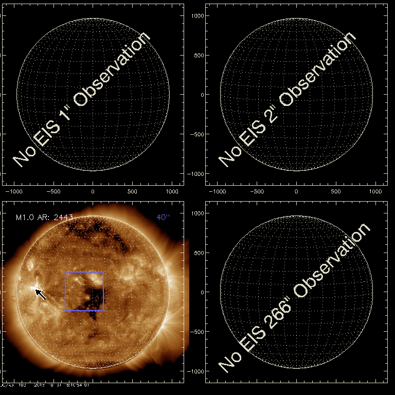 EIS Observation timeline overlay to GOES-Xray curve Code 1" 2" 40" 266" EIS Observations list for this event: STUDY ACRONYM ID DATE OBSERVED DESCRIPTION NOAA# TARGET 0 PRY_slot_context_v3 | 49312 | 2015/10/31 10:34:14 | HOP151 | 2441 | Active Region TIMELINE ID DATE OBSERVED FITS FILE XCEN (+W/-E) YCEN (+N/-S) DUR ----------------------------------------------------------------------------------------------------------------- 49312 | 2015/10/31 10:34:14.000 | eis_l0_20151031_103414.fits.gz | -106.32 | 6.51 | 2m57s : Check study information : Download file : View thumbnails For this event, also check for: