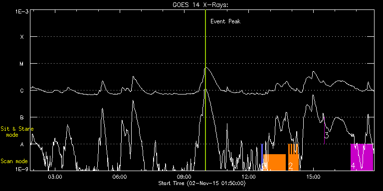 EIS Observation timeline overlay to GOES-Xray curve Code 1" 2" 40" 266" EIS Observations list for this event: STUDY ACRONYM ID DATE OBSERVED DESCRIPTION NOAA# TARGET 0 PRY_slot_context_v3 | 49315 | 2015/11/02 12:35:12 | Spectral atlas (AR) | 2443 | Active Region TIMELINE ID DATE OBSERVED FITS FILE XCEN (+W/-E) YCEN (+N/-S) DUR ----------------------------------------------------------------------------------------------------------------- 49315 | 2015/11/02 12:35:12.000 | eis_l0_20151102_123512.fits.gz | -398.17 | 15.42 | 2m56s 1 Atlas_60 | 49316 | 2015/11/02 12:40:32 | Spectral atlas (AR) | | Quiet Sun TIMELINE ID DATE OBSERVED FITS FILE XCEN (+W/-E) YCEN (+N/-S) DUR ----------------------------------------------------------------------------------------------------------------- 49316 | 2015/11/02 12:40:32.000 | eis_l0_20151102_124032.fits.gz | -389.14 | 48.50 | 1h1m39s 2 HH_Flare_raster_v6 | 49324 | 2015/11/02 13:50:12 | AR12443 observation | | Flare TIMELINE ID DATE OBSERVED FITS FILE XCEN (+W/-E) YCEN (+N/-S) DUR ----------------------------------------------------------------------------------------------------------------- 49324 | 2015/11/02 13:50:12.000 | eis_l0_20151102_135012.fits.gz | -408.73 | 57.19 | 3m32s 49324 | 2015/11/02 13:53:46.000 | eis_l0_20151102_135346.fits.gz | -408.19 | 57.19 | 3m32s 49324 | 2015/11/02 13:57:20.000 | eis_l0_20151102_135720.fits.gz | -407.72 | 57.19 | 3m31s 49324 | 2015/11/02 14:00:54.000 | eis_l0_20151102_140054.fits.gz | -407.26 | 57.11 | 3m32s 49324 | 2015/11/02 14:04:29.000 | eis_l0_20151102_140429.fits.gz | -406.72 | 57.11 | 3m31s 49324 | 2015/11/02 14:08:03.000 | eis_l0_20151102_140803.fits.gz | -406.10 | 57.19 | 3m31s 49324 | 2015/11/02 14:11:37.000 | eis_l0_20151102_141137.fits.gz | -405.64 | 57.19 | 3m31s 49324 | 2015/11/02 14:15:11.000 | eis_l0_20151102_141511.fits.gz | -405.10 | 57.19 | 3m32s 3 regcal077 | 49317 | 2015/11/02 15:30:11 | Flatfield, 2 exposures, led 80ms, full | | Engineering TIMELINE ID DATE OBSERVED FITS FILE XCEN (+W/-E) YCEN (+N/-S) DUR ----------------------------------------------------------------------------------------------------------------- 49317 | 2015/11/02 15:30:11.000 | eis_l0_20151102_153011.fits.gz | 160.20 | 234.00 | 4s 4 HPW021VEL120x512v1_b | 49320 | 2015/11/02 16:44:25 | AR observation | | Active Region TIMELINE ID DATE OBSERVED FITS FILE XCEN (+W/-E) YCEN (+N/-S) DUR ----------------------------------------------------------------------------------------------------------------- 49320 | 2015/11/02 16:44:25.000 | eis_l0_20151102_164425.fits.gz | 126.50 | 372.08 | 1h1m54s : Check study information : Download file : View thumbnails For this event, also check for: