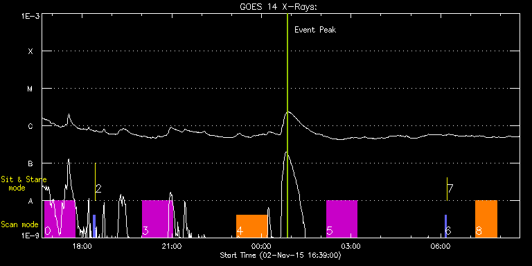 EIS Observation timeline overlay to GOES-Xray curve Code 1" 2" 40" 266" EIS Observations list for this event: STUDY ACRONYM ID DATE OBSERVED DESCRIPTION NOAA# TARGET 0 HPW021VEL120x512v1_b | 49320 | 2015/11/02 16:44:25 | AR observation | | Active Region TIMELINE ID DATE OBSERVED FITS FILE XCEN (+W/-E) YCEN (+N/-S) DUR ----------------------------------------------------------------------------------------------------------------- 49320 | 2015/11/02 16:44:25.000 | eis_l0_20151102_164425.fits.gz | 126.50 | 372.08 | 1h1m54s 1 PRY_slot_contextLITE | 49308 | 2015/11/02 18:22:33 | Pointing monitoring | 2446 | Active Region TIMELINE ID DATE OBSERVED FITS FILE XCEN (+W/-E) YCEN (+N/-S) DUR ----------------------------------------------------------------------------------------------------------------- 49308 | 2015/11/02 18:22:33.000 | eis_l0_20151102_182233.fits.gz | -15.29 | -0.50 | 2m57s 2 XRT_synop_AIA | 49310 | 2015/11/02 18:26:25 | AR12443 observation | | Quiet Sun TIMELINE ID DATE OBSERVED FITS FILE XCEN (+W/-E) YCEN (+N/-S) DUR ----------------------------------------------------------------------------------------------------------------- 49310 | 2015/11/02 18:26:25.000 | eis_l0_20151102_182625.fits.gz | -132.49 | -0.50 | 10s 3 HPW021VEL120x512v1_b | 49329 | 2015/11/02 20:00:32 | AR observation | | Active Region TIMELINE ID DATE OBSERVED FITS FILE XCEN (+W/-E) YCEN (+N/-S) DUR ----------------------------------------------------------------------------------------------------------------- 49329 | 2015/11/02 20:00:32.000 | eis_l0_20151102_200032.fits.gz | 156.50 | 376.93 | 1h1m54s 4 Atlas_60 | 49327 | 2015/11/02 23:10:25 | AR observation | | Quiet Sun TIMELINE ID DATE OBSERVED FITS FILE XCEN (+W/-E) YCEN (+N/-S) DUR ----------------------------------------------------------------------------------------------------------------- 49327 | 2015/11/02 23:10:25.000 | eis_l0_20151102_231025.fits.gz | 202.73 | 314.47 | 1h1m40s 5 HPW021VEL120x512v1_b | 49321 | 2015/11/03 02:10:25 | AR observation | | Active Region TIMELINE ID DATE OBSERVED FITS FILE XCEN (+W/-E) YCEN (+N/-S) DUR ----------------------------------------------------------------------------------------------------------------- 49321 | 2015/11/03 02:10:25.000 | eis_l0_20151103_021025.fits.gz | 189.98 | 390.32 | 1h1m54s 6 PRY_slot_contextLITE | 49309 | 2015/11/03 06:08:32 | Pointing monitoring | | Active Region TIMELINE ID DATE OBSERVED FITS FILE XCEN (+W/-E) YCEN (+N/-S) DUR ----------------------------------------------------------------------------------------------------------------- 49309 | 2015/11/03 06:08:32.000 | eis_l0_20151103_060832.fits.gz | -15.29 | -0.50 | 2m56s 7 XRT_synop_AIA | 49311 | 2015/11/03 06:12:25 | Pointing monitoring | | Quiet Sun TIMELINE ID DATE OBSERVED FITS FILE XCEN (+W/-E) YCEN (+N/-S) DUR ----------------------------------------------------------------------------------------------------------------- 49311 | 2015/11/03 06:12:25.000 | eis_l0_20151103_061225.fits.gz | -132.49 | -0.42 | 10s 8 eis_tornadoes_scan_n | 49318 | 2015/11/03 07:10:18 | IHOP237 | | Filament TIMELINE ID DATE OBSERVED FITS FILE XCEN (+W/-E) YCEN (+N/-S) DUR ----------------------------------------------------------------------------------------------------------------- 49318 | 2015/11/03 07:10:18.000 | eis_l0_20151103_071018.fits.gz | 881.99 | -394.56 | 43m3s : Check study information : Download file : View thumbnails For this event, also check for: