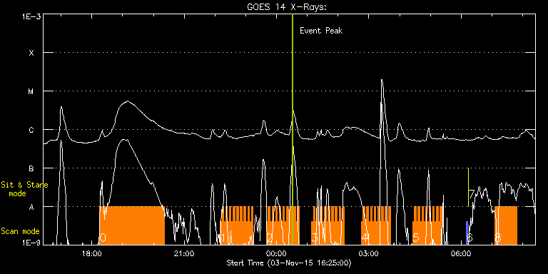 EIS Observation timeline overlay to GOES-Xray curve Code 1" 2" 40" 266" EIS Observations list for this event: STUDY ACRONYM ID DATE OBSERVED DESCRIPTION NOAA# TARGET 0 cam_ar_limb_lite_v2 | 49346 | 2015/11/03 18:15:13 | AR Temperature diagnostic (E-limb) | | Active Region TIMELINE ID DATE OBSERVED FITS FILE XCEN (+W/-E) YCEN (+N/-S) DUR ----------------------------------------------------------------------------------------------------------------- 49346 | 2015/11/03 18:15:13.000 | eis_l0_20151103_181513.fits.gz | -9883.43 | -9965.20 | 2h6m2s 1 HH_Flare_raster_v6 | 49348 | 2015/11/03 22:10:13 | AR12443 observation | | Flare TIMELINE ID DATE OBSERVED FITS FILE XCEN (+W/-E) YCEN (+N/-S) DUR ----------------------------------------------------------------------------------------------------------------- 49348 | 2015/11/03 22:10:13.000 | eis_l0_20151103_221013.fits.gz | -141.94 | 45.13 | 3m32s 49348 | 2015/11/03 22:13:48.000 | eis_l0_20151103_221348.fits.gz | -141.40 | 45.13 | 3m31s 49348 | 2015/11/03 22:17:22.000 | eis_l0_20151103_221722.fits.gz | -140.86 | 45.13 | 3m32s 49348 | 2015/11/03 22:20:56.000 | eis_l0_20151103_222056.fits.gz | -140.32 | 45.05 | 3m32s 49348 | 2015/11/03 22:24:31.000 | eis_l0_20151103_222431.fits.gz | -139.70 | 45.05 | 3m31s 49348 | 2015/11/03 22:28:05.000 | eis_l0_20151103_222805.fits.gz | -139.16 | 45.05 | 3m31s 49348 | 2015/11/03 22:31:39.000 | eis_l0_20151103_223139.fits.gz | -138.54 | 45.05 | 3m31s 49348 | 2015/11/03 22:35:13.000 | eis_l0_20151103_223513.fits.gz | -138.08 | 45.05 | 3m31s 49348 | 2015/11/03 22:38:47.000 | eis_l0_20151103_223847.fits.gz | -137.39 | 45.05 | 3m32s 49348 | 2015/11/03 22:42:22.000 | eis_l0_20151103_224222.fits.gz | -137.00 | 45.05 | 3m31s 49348 | 2015/11/03 22:45:55.000 | eis_l0_20151103_224555.fits.gz | -136.54 | 45.05 | 3m32s 49348 | 2015/11/03 22:49:29.000 | eis_l0_20151103_224929.fits.gz | -135.92 | 45.05 | 3m32s 49348 | 2015/11/03 22:53:04.000 | eis_l0_20151103_225304.fits.gz | -135.30 | 45.05 | 3m32s 49348 | 2015/11/03 22:56:38.000 | eis_l0_20151103_225638.fits.gz | -134.68 | 45.13 | 3m32s 49348 | 2015/11/03 23:00:13.000 | eis_l0_20151103_230013.fits.gz | -134.22 | 45.05 | 3m31s 49348 | 2015/11/03 23:03:47.000 | eis_l0_20151103_230347.fits.gz | -133.60 | 45.13 | 3m31s 49348 | 2015/11/03 23:07:21.000 | eis_l0_20151103_230721.fits.gz | -133.14 | 44.97 | 3m31s 49348 | 2015/11/03 23:10:55.000 | eis_l0_20151103_231055.fits.gz | -132.60 | 45.05 | 3m31s 2 HH_Flare_raster_v6 | 49349 | 2015/11/03 23:40:13 | AR12443 observation | | Flare TIMELINE ID DATE OBSERVED FITS FILE XCEN (+W/-E) YCEN (+N/-S) DUR ----------------------------------------------------------------------------------------------------------------- 49349 | 2015/11/03 23:40:13.000 | eis_l0_20151103_234013.fits.gz | -128.04 | 45.21 | 3m32s 49349 | 2015/11/03 23:43:48.000 | eis_l0_20151103_234348.fits.gz | -127.42 | 45.05 | 3m32s 49349 | 2015/11/03 23:47:23.000 | eis_l0_20151103_234723.fits.gz | -126.96 | 45.05 | 3m31s 49349 | 2015/11/03 23:50:57.000 | eis_l0_20151103_235057.fits.gz | -126.34 | 44.97 | 3m31s 49349 | 2015/11/03 23:54:31.000 | eis_l0_20151103_235431.fits.gz | -125.80 | 45.05 | 3m31s 49349 | 2015/11/03 23:58:05.000 | eis_l0_20151103_235805.fits.gz | -125.26 | 45.05 | 3m31s 49349 | 2015/11/04 00:01:39.000 | eis_l0_20151104_000139.fits.gz | -124.64 | 44.97 | 3m32s 49349 | 2015/11/04 00:05:14.000 | eis_l0_20151104_000514.fits.gz | -124.10 | 45.13 | 3m32s 49349 | 2015/11/04 00:08:48.000 | eis_l0_20151104_000848.fits.gz | -123.64 | 45.05 | 3m31s 49349 | 2015/11/04 00:12:22.000 | eis_l0_20151104_001222.fits.gz | -123.02 | 44.97 | 3m32s 49349 | 2015/11/04 00:15:56.000 | eis_l0_20151104_001556.fits.gz | -122.48 | 44.97 | 3m33s 49349 | 2015/11/04 00:19:32.000 | eis_l0_20151104_001932.fits.gz | -121.94 | 45.13 | 3m31s 49349 | 2015/11/04 00:23:06.000 | eis_l0_20151104_002306.fits.gz | -121.32 | 44.97 | 3m31s 49349 | 2015/11/04 00:26:40.000 | eis_l0_20151104_002640.fits.gz | -120.86 | 44.97 | 3m31s 49349 | 2015/11/04 00:30:14.000 | eis_l0_20151104_003014.fits.gz | -120.24 | 44.97 | 3m31s 49349 | 2015/11/04 00:33:48.000 | eis_l0_20151104_003348.fits.gz | -119.70 | 45.05 | 3m31s 49349 | 2015/11/04 00:37:21.000 | eis_l0_20151104_003721.fits.gz | -119.15 | 44.97 | 3m32s 49349 | 2015/11/04 00:40:56.000 | eis_l0_20151104_004056.fits.gz | -118.61 | 45.05 | 3m32s 3 HH_Flare_raster_v6 | 49350 | 2015/11/04 01:08:13 | AR12443 observation | | Flare TIMELINE ID DATE OBSERVED FITS FILE XCEN (+W/-E) YCEN (+N/-S) DUR ----------------------------------------------------------------------------------------------------------------- 49350 | 2015/11/04 01:08:13.000 | eis_l0_20151104_010813.fits.gz | -114.37 | 45.13 | 3m32s 49350 | 2015/11/04 01:11:47.000 | eis_l0_20151104_011147.fits.gz | -113.82 | 45.05 | 3m32s 49350 | 2015/11/04 01:15:22.000 | eis_l0_20151104_011522.fits.gz | -113.21 | 45.05 | 3m30s 49350 | 2015/11/04 01:18:55.000 | eis_l0_20151104_011855.fits.gz | -112.74 | 45.13 | 3m31s 49350 | 2015/11/04 01:22:29.000 | eis_l0_20151104_012229.fits.gz | -112.20 | 45.13 | 3m31s 49350 | 2015/11/04 01:26:03.000 | eis_l0_20151104_012603.fits.gz | -111.66 | 44.97 | 3m31s 49350 | 2015/11/04 01:29:37.000 | eis_l0_20151104_012937.fits.gz | -111.04 | 44.97 | 3m32s 49350 | 2015/11/04 01:33:12.000 | eis_l0_20151104_013312.fits.gz | -110.50 | 45.05 | 3m31s 49350 | 2015/11/04 01:36:46.000 | eis_l0_20151104_013646.fits.gz | -109.96 | 45.05 | 3m32s 49350 | 2015/11/04 01:40:20.000 | eis_l0_20151104_014020.fits.gz | -109.42 | 45.05 | 3m32s 49350 | 2015/11/04 01:43:55.000 | eis_l0_20151104_014355.fits.gz | -108.80 | 44.97 | 3m31s 49350 | 2015/11/04 01:47:28.000 | eis_l0_20151104_014728.fits.gz | -108.26 | 44.90 | 3m32s 49350 | 2015/11/04 01:51:03.000 | eis_l0_20151104_015103.fits.gz | -107.72 | 45.13 | 3m31s 49350 | 2015/11/04 01:54:37.000 | eis_l0_20151104_015437.fits.gz | -107.26 | 45.05 | 3m32s 49350 | 2015/11/04 01:58:11.000 | eis_l0_20151104_015811.fits.gz | -106.64 | 45.05 | 3m32s 49350 | 2015/11/04 02