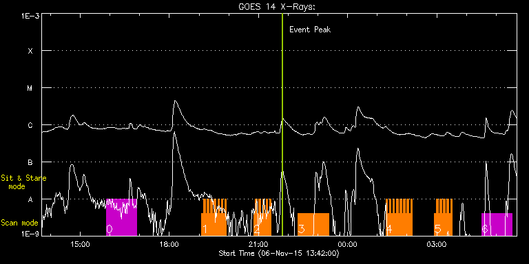EIS Observation timeline overlay to GOES-Xray curve Code 1" 2" 40" 266" EIS Observations list for this event: STUDY ACRONYM ID DATE OBSERVED DESCRIPTION NOAA# TARGET 0 HPW021VEL120x512v1_b | 49376 | 2015/11/06 15:52:25 | AR 12443 observation | | Active Region TIMELINE ID DATE OBSERVED FITS FILE XCEN (+W/-E) YCEN (+N/-S) DUR ----------------------------------------------------------------------------------------------------------------- 49376 | 2015/11/06 15:52:25.000 | eis_l0_20151106_155225.fits.gz | 502.65 | 174.02 | 1h1m53s 1 HH_Flare_raster_v6 | 49378 | 2015/11/06 19:05:26 | AR 12443 observation | | Flare TIMELINE ID DATE OBSERVED FITS FILE XCEN (+W/-E) YCEN (+N/-S) DUR ----------------------------------------------------------------------------------------------------------------- 49378 | 2015/11/06 19:05:26.000 | eis_l0_20151106_190526.fits.gz | 535.66 | 93.33 | 3m31s 49378 | 2015/11/06 19:09:00.000 | eis_l0_20151106_190900.fits.gz | 536.12 | 93.41 | 3m31s 49378 | 2015/11/06 19:12:34.000 | eis_l0_20151106_191234.fits.gz | 536.59 | 93.41 | 3m32s 49378 | 2015/11/06 19:16:09.000 | eis_l0_20151106_191609.fits.gz | 537.05 | 93.41 | 3m31s 49378 | 2015/11/06 19:19:43.000 | eis_l0_20151106_191943.fits.gz | 537.36 | 93.41 | 3m31s 49378 | 2015/11/06 19:23:17.000 | eis_l0_20151106_192317.fits.gz | 537.90 | 93.56 | 3m32s 49378 | 2015/11/06 19:26:52.000 | eis_l0_20151106_192652.fits.gz | 538.44 | 93.49 | 3m31s 49378 | 2015/11/06 19:30:26.000 | eis_l0_20151106_193026.fits.gz | 538.98 | 93.56 | 3m31s 49378 | 2015/11/06 19:34:00.000 | eis_l0_20151106_193400.fits.gz | 539.37 | 93.56 | 3m32s 49378 | 2015/11/06 19:37:34.000 | eis_l0_20151106_193734.fits.gz | 539.83 | 93.41 | 3m32s 49378 | 2015/11/06 19:41:09.000 | eis_l0_20151106_194109.fits.gz | 540.22 | 93.64 | 3m31s 49378 | 2015/11/06 19:44:43.000 | eis_l0_20151106_194443.fits.gz | 540.76 | 93.72 | 3m32s 49378 | 2015/11/06 19:48:17.000 | eis_l0_20151106_194817.fits.gz | 541.15 | 93.72 | 3m32s 49378 | 2015/11/06 19:51:52.000 | eis_l0_20151106_195152.fits.gz | 541.53 | 93.64 | 3m31s 2 HH_Flare_raster_v6 | 49379 | 2015/11/06 20:50:12 | AR 12443 observation | | Flare TIMELINE ID DATE OBSERVED FITS FILE XCEN (+W/-E) YCEN (+N/-S) DUR ----------------------------------------------------------------------------------------------------------------- 49379 | 2015/11/06 20:50:12.000 | eis_l0_20151106_205012.fits.gz | 549.03 | 94.10 | 3m31s 49379 | 2015/11/06 20:53:46.000 | eis_l0_20151106_205346.fits.gz | 549.57 | 94.10 | 3m32s 49379 | 2015/11/06 20:57:20.000 | eis_l0_20151106_205720.fits.gz | 549.95 | 94.10 | 3m32s 49379 | 2015/11/06 21:00:55.000 | eis_l0_20151106_210055.fits.gz | 550.41 | 94.10 | 3m32s 49379 | 2015/11/06 21:04:30.000 | eis_l0_20151106_210430.fits.gz | 550.96 | 94.03 | 3m31s 49379 | 2015/11/06 21:08:04.000 | eis_l0_20151106_210804.fits.gz | 551.34 | 94.18 | 3m32s 49379 | 2015/11/06 21:11:38.000 | eis_l0_20151106_211138.fits.gz | 551.80 | 94.26 | 3m32s 49379 | 2015/11/06 21:15:13.000 | eis_l0_20151106_211513.fits.gz | 552.27 | 94.26 | 3m32s 49379 | 2015/11/06 21:18:47.000 | eis_l0_20151106_211847.fits.gz | 552.73 | 94.34 | 3m32s 49379 | 2015/11/06 21:22:22.000 | eis_l0_20151106_212222.fits.gz | 553.27 | 94.26 | 3m31s 3 Atlas_60 | 49380 | 2015/11/06 22:20:11 | AR 12443 observation | | Quiet Sun TIMELINE ID DATE OBSERVED FITS FILE XCEN (+W/-E) YCEN (+N/-S) DUR ----------------------------------------------------------------------------------------------------------------- 49380 | 2015/11/06 22:20:11.000 | eis_l0_20151106_222011.fits.gz | 561.03 | 94.72 | 1h1m39s 4 HH_Flare_raster_v6 | 49374 | 2015/11/07 01:17:11 | AR 12443 observation | 2443 | Flare TIMELINE ID DATE OBSERVED FITS FILE XCEN (+W/-E) YCEN (+N/-S) DUR ----------------------------------------------------------------------------------------------------------------- 49374 | 2015/11/07 01:17:11.000 | eis_l0_20151107_011711.fits.gz | 582.63 | 96.04 | 3m32s 49374 | 2015/11/07 01:20:46.000 | eis_l0_20151107_012046.fits.gz | 583.09 | 96.11 | 3m31s 49374 | 2015/11/07 01:24:20.000 | eis_l0_20151107_012420.fits.gz | 583.48 | 96.11 | 3m32s 49374 | 2015/11/07 01:27:55.000 | eis_l0_20151107_012755.fits.gz | 584.02 | 96.11 | 3m31s 49374 | 2015/11/07 01:31:29.000 | eis_l0_20151107_013129.fits.gz | 584.25 | 96.27 | 3m31s 49374 | 2015/11/07 01:35:02.000 | eis_l0_20151107_013502.fits.gz | 584.79 | 96.04 | 3m32s 49374 | 2015/11/07 01:38:37.000 | eis_l0_20151107_013837.fits.gz | 585.33 | 96.19 | 3m31s 49374 | 2015/11/07 01:42:11.000 | eis_l0_20151107_014211.fits.gz | 585.72 | 96.27 | 3m31s 49374 | 2015/11/07 01:45:45.000 | eis_l0_20151107_014545.fits.gz | 586.10 | 96.27 | 3m31s 49374 | 2015/11/07 01:49:19.000 | eis_l0_20151107_014919.fits.gz | 586.64 | 96.19 | 3m31s 49374 | 2015/11/07 01:52:53.000 | eis_l0_20151107_015253.fits.gz | 587.03 | 96.27 | 3m32s 49374 | 2015/11/07 01:56:27.000 | eis_l0_20151107_015627.fits.gz | 587.42 | 96.34 | 3m32s 49374 | 2015/11/07 02:00:02.000 | eis_l0_20151107_020002.fits.gz | 587.88 | 96.34 | 3m32s 49374 | 2015/11/07 02:03:36.000 | eis_l0_20151107_020336.fits.gz | 588.34 | 96.42 | 3m31s 49374 | 2015/11/07 02:07:10.000 | eis_l0_20151107_020710.fits.gz | 588.81 | 96.42 | 3m32s 5 HH_Flare_raster_v6 | 49375 | 2015/11/07 02:55:38 | AR 12443 observation | 2443 | Flare TIMELINE ID DATE OBSERVED FITS FILE XCEN (+W/-E) YCEN (+N/-S) DUR ----------------------------------------------------------------------------------------------------------------- 49375 | 2015/11/07 02:55:38.000 | eis_l0_20151107_025538.fits.gz | 594.68 | 96.89 | 3m32s 49375 | 2015/11/07 02:59:13.000 | eis_l0_20151107_025913.fits.gz | 595.14 | 96.89 | 3m31s 49375 | 2015/11/07 03:02:47.000 | eis_l0_20151107_030247.fits.gz | 595.60 | 96.89 | 3m31s 49375 | 2015/11/07 03:06:21.000 | eis_l0_20151107_030621.fits.gz | 595.99 | 96.89 | 3m31s 49375 | 2015/11/07 03:09:54.000 | eis_l0_20151107_030954.fits.gz | 596.46 | 96.96 | 3m32s 49375 | 2015/11/07 03:13:29.000 | eis_l0_20151107_031329.fits.gz | 596.92 | 96.81 | 3m31s 4