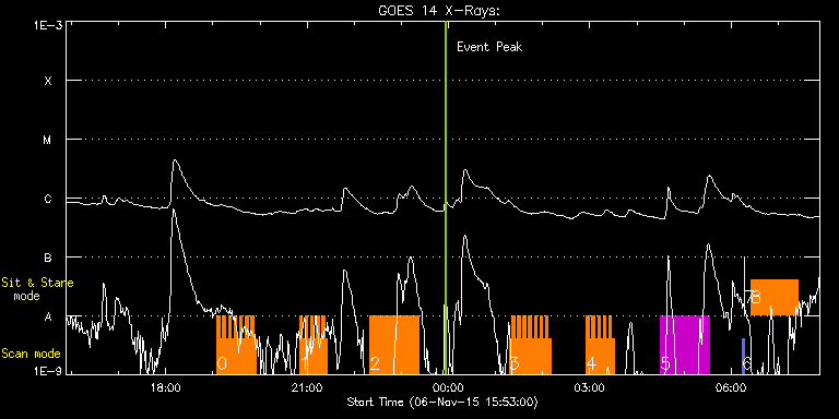 EIS Observation timeline overlay to GOES-Xray curve Code 1" 2" 40" 266" EIS Observations list for this event: STUDY ACRONYM ID DATE OBSERVED DESCRIPTION NOAA# TARGET 0 HH_Flare_raster_v6 | 49378 | 2015/11/06 19:05:26 | AR 12443 observation | | Flare TIMELINE ID DATE OBSERVED FITS FILE XCEN (+W/-E) YCEN (+N/-S) DUR ----------------------------------------------------------------------------------------------------------------- 49378 | 2015/11/06 19:05:26.000 | eis_l0_20151106_190526.fits.gz | 535.66 | 93.33 | 3m31s 49378 | 2015/11/06 19:09:00.000 | eis_l0_20151106_190900.fits.gz | 536.12 | 93.41 | 3m31s 49378 | 2015/11/06 19:12:34.000 | eis_l0_20151106_191234.fits.gz | 536.59 | 93.41 | 3m32s 49378 | 2015/11/06 19:16:09.000 | eis_l0_20151106_191609.fits.gz | 537.05 | 93.41 | 3m31s 49378 | 2015/11/06 19:19:43.000 | eis_l0_20151106_191943.fits.gz | 537.36 | 93.41 | 3m31s 49378 | 2015/11/06 19:23:17.000 | eis_l0_20151106_192317.fits.gz | 537.90 | 93.56 | 3m32s 49378 | 2015/11/06 19:26:52.000 | eis_l0_20151106_192652.fits.gz | 538.44 | 93.49 | 3m31s 49378 | 2015/11/06 19:30:26.000 | eis_l0_20151106_193026.fits.gz | 538.98 | 93.56 | 3m31s 49378 | 2015/11/06 19:34:00.000 | eis_l0_20151106_193400.fits.gz | 539.37 | 93.56 | 3m32s 49378 | 2015/11/06 19:37:34.000 | eis_l0_20151106_193734.fits.gz | 539.83 | 93.41 | 3m32s 49378 | 2015/11/06 19:41:09.000 | eis_l0_20151106_194109.fits.gz | 540.22 | 93.64 | 3m31s 49378 | 2015/11/06 19:44:43.000 | eis_l0_20151106_194443.fits.gz | 540.76 | 93.72 | 3m32s 49378 | 2015/11/06 19:48:17.000 | eis_l0_20151106_194817.fits.gz | 541.15 | 93.72 | 3m32s 49378 | 2015/11/06 19:51:52.000 | eis_l0_20151106_195152.fits.gz | 541.53 | 93.64 | 3m31s 1 HH_Flare_raster_v6 | 49379 | 2015/11/06 20:50:12 | AR 12443 observation | | Flare TIMELINE ID DATE OBSERVED FITS FILE XCEN (+W/-E) YCEN (+N/-S) DUR ----------------------------------------------------------------------------------------------------------------- 49379 | 2015/11/06 20:50:12.000 | eis_l0_20151106_205012.fits.gz | 549.03 | 94.10 | 3m31s 49379 | 2015/11/06 20:53:46.000 | eis_l0_20151106_205346.fits.gz | 549.57 | 94.10 | 3m32s 49379 | 2015/11/06 20:57:20.000 | eis_l0_20151106_205720.fits.gz | 549.95 | 94.10 | 3m32s 49379 | 2015/11/06 21:00:55.000 | eis_l0_20151106_210055.fits.gz | 550.41 | 94.10 | 3m32s 49379 | 2015/11/06 21:04:30.000 | eis_l0_20151106_210430.fits.gz | 550.96 | 94.03 | 3m31s 49379 | 2015/11/06 21:08:04.000 | eis_l0_20151106_210804.fits.gz | 551.34 | 94.18 | 3m32s 49379 | 2015/11/06 21:11:38.000 | eis_l0_20151106_211138.fits.gz | 551.80 | 94.26 | 3m32s 49379 | 2015/11/06 21:15:13.000 | eis_l0_20151106_211513.fits.gz | 552.27 | 94.26 | 3m32s 49379 | 2015/11/06 21:18:47.000 | eis_l0_20151106_211847.fits.gz | 552.73 | 94.34 | 3m32s 49379 | 2015/11/06 21:22:22.000 | eis_l0_20151106_212222.fits.gz | 553.27 | 94.26 | 3m31s 2 Atlas_60 | 49380 | 2015/11/06 22:20:11 | AR 12443 observation | | Quiet Sun TIMELINE ID DATE OBSERVED FITS FILE XCEN (+W/-E) YCEN (+N/-S) DUR ----------------------------------------------------------------------------------------------------------------- 49380 | 2015/11/06 22:20:11.000 | eis_l0_20151106_222011.fits.gz | 561.03 | 94.72 | 1h1m39s 3 HH_Flare_raster_v6 | 49374 | 2015/11/07 01:17:11 | AR 12443 observation | 2443 | Flare TIMELINE ID DATE OBSERVED FITS FILE XCEN (+W/-E) YCEN (+N/-S) DUR ----------------------------------------------------------------------------------------------------------------- 49374 | 2015/11/07 01:17:11.000 | eis_l0_20151107_011711.fits.gz | 582.63 | 96.04 | 3m32s 49374 | 2015/11/07 01:20:46.000 | eis_l0_20151107_012046.fits.gz | 583.09 | 96.11 | 3m31s 49374 | 2015/11/07 01:24:20.000 | eis_l0_20151107_012420.fits.gz | 583.48 | 96.11 | 3m32s 49374 | 2015/11/07 01:27:55.000 | eis_l0_20151107_012755.fits.gz | 584.02 | 96.11 | 3m31s 49374 | 2015/11/07 01:31:29.000 | eis_l0_20151107_013129.fits.gz | 584.25 | 96.27 | 3m31s 49374 | 2015/11/07 01:35:02.000 | eis_l0_20151107_013502.fits.gz | 584.79 | 96.04 | 3m32s 49374 | 2015/11/07 01:38:37.000 | eis_l0_20151107_013837.fits.gz | 585.33 | 96.19 | 3m31s 49374 | 2015/11/07 01:42:11.000 | eis_l0_20151107_014211.fits.gz | 585.72 | 96.27 | 3m31s 49374 | 2015/11/07 01:45:45.000 | eis_l0_20151107_014545.fits.gz | 586.10 | 96.27 | 3m31s 49374 | 2015/11/07 01:49:19.000 | eis_l0_20151107_014919.fits.gz | 586.64 | 96.19 | 3m31s 49374 | 2015/11/07 01:52:53.000 | eis_l0_20151107_015253.fits.gz | 587.03 | 96.27 | 3m32s 49374 | 2015/11/07 01:56:27.000 | eis_l0_20151107_015627.fits.gz | 587.42 | 96.34 | 3m32s 49374 | 2015/11/07 02:00:02.000 | eis_l0_20151107_020002.fits.gz | 587.88 | 96.34 | 3m32s 49374 | 2015/11/07 02:03:36.000 | eis_l0_20151107_020336.fits.gz | 588.34 | 96.42 | 3m31s 49374 | 2015/11/07 02:07:10.000 | eis_l0_20151107_020710.fits.gz | 588.81 | 96.42 | 3m32s 4 HH_Flare_raster_v6 | 49375 | 2015/11/07 02:55:38 | AR 12443 observation | 2443 | Flare TIMELINE ID DATE OBSERVED FITS FILE XCEN (+W/-E) YCEN (+N/-S) DUR ----------------------------------------------------------------------------------------------------------------- 49375 | 2015/11/07 02:55:38.000 | eis_l0_20151107_025538.fits.gz | 594.68 | 96.89 | 3m32s 49375 | 2015/11/07 02:59:13.000 | eis_l0_20151107_025913.fits.gz | 595.14 | 96.89 | 3m31s 49375 | 2015/11/07 03:02:47.000 | eis_l0_20151107_030247.fits.gz | 595.60 | 96.89 | 3m31s 49375 | 2015/11/07 03:06:21.000 | eis_l0_20151107_030621.fits.gz | 595.99 | 96.89 | 3m31s 49375 | 2015/11/07 03:09:54.000 | eis_l0_20151107_030954.fits.gz | 596.46 | 96.96 | 3m32s 49375 | 2015/11/07 03:13:29.000 | eis_l0_20151107_031329.fits.gz | 596.92 | 96.81 | 3m31s 49375 | 2015/11/07 03:17:03.000 | eis_l0_20151107_031703.fits.gz | 597.38 | 96.89 | 3m31s 49375 | 2015/11/07 03:20:37.000 | eis_l0_20151107_032037.fits.gz | 597.69 | 97.04 | 3m32s 49375 | 2015/11/07 03:24:12.000 | eis_l0_20151107_032412.fits.gz | 598.15 | 96.89 | 3m31s 49375 | 2015/11/07 03:27:46.000 | eis_l0_20151107_032746.fits.gz | 598.62 | 96.89 | 3m31s 5 HPW021