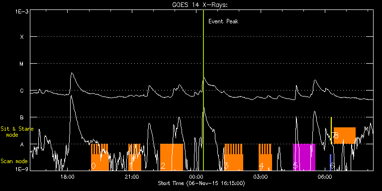 EIS Observation timeline overlay to GOES-Xray curve Code 1" 2" 40" 266" EIS Observations list for this event: STUDY ACRONYM ID DATE OBSERVED DESCRIPTION NOAA# TARGET 0 HH_Flare_raster_v6 | 49378 | 2015/11/06 19:05:26 | AR 12443 observation | | Flare TIMELINE ID DATE OBSERVED FITS FILE XCEN (+W/-E) YCEN (+N/-S) DUR ----------------------------------------------------------------------------------------------------------------- 49378 | 2015/11/06 19:05:26.000 | eis_l0_20151106_190526.fits.gz | 535.66 | 93.33 | 3m31s 49378 | 2015/11/06 19:09:00.000 | eis_l0_20151106_190900.fits.gz | 536.12 | 93.41 | 3m31s 49378 | 2015/11/06 19:12:34.000 | eis_l0_20151106_191234.fits.gz | 536.59 | 93.41 | 3m32s 49378 | 2015/11/06 19:16:09.000 | eis_l0_20151106_191609.fits.gz | 537.05 | 93.41 | 3m31s 49378 | 2015/11/06 19:19:43.000 | eis_l0_20151106_191943.fits.gz | 537.36 | 93.41 | 3m31s 49378 | 2015/11/06 19:23:17.000 | eis_l0_20151106_192317.fits.gz | 537.90 | 93.56 | 3m32s 49378 | 2015/11/06 19:26:52.000 | eis_l0_20151106_192652.fits.gz | 538.44 | 93.49 | 3m31s 49378 | 2015/11/06 19:30:26.000 | eis_l0_20151106_193026.fits.gz | 538.98 | 93.56 | 3m31s 49378 | 2015/11/06 19:34:00.000 | eis_l0_20151106_193400.fits.gz | 539.37 | 93.56 | 3m32s 49378 | 2015/11/06 19:37:34.000 | eis_l0_20151106_193734.fits.gz | 539.83 | 93.41 | 3m32s 49378 | 2015/11/06 19:41:09.000 | eis_l0_20151106_194109.fits.gz | 540.22 | 93.64 | 3m31s 49378 | 2015/11/06 19:44:43.000 | eis_l0_20151106_194443.fits.gz | 540.76 | 93.72 | 3m32s 49378 | 2015/11/06 19:48:17.000 | eis_l0_20151106_194817.fits.gz | 541.15 | 93.72 | 3m32s 49378 | 2015/11/06 19:51:52.000 | eis_l0_20151106_195152.fits.gz | 541.53 | 93.64 | 3m31s 1 HH_Flare_raster_v6 | 49379 | 2015/11/06 20:50:12 | AR 12443 observation | | Flare TIMELINE ID DATE OBSERVED FITS FILE XCEN (+W/-E) YCEN (+N/-S) DUR ----------------------------------------------------------------------------------------------------------------- 49379 | 2015/11/06 20:50:12.000 | eis_l0_20151106_205012.fits.gz | 549.03 | 94.10 | 3m31s 49379 | 2015/11/06 20:53:46.000 | eis_l0_20151106_205346.fits.gz | 549.57 | 94.10 | 3m32s 49379 | 2015/11/06 20:57:20.000 | eis_l0_20151106_205720.fits.gz | 549.95 | 94.10 | 3m32s 49379 | 2015/11/06 21:00:55.000 | eis_l0_20151106_210055.fits.gz | 550.41 | 94.10 | 3m32s 49379 | 2015/11/06 21:04:30.000 | eis_l0_20151106_210430.fits.gz | 550.96 | 94.03 | 3m31s 49379 | 2015/11/06 21:08:04.000 | eis_l0_20151106_210804.fits.gz | 551.34 | 94.18 | 3m32s 49379 | 2015/11/06 21:11:38.000 | eis_l0_20151106_211138.fits.gz | 551.80 | 94.26 | 3m32s 49379 | 2015/11/06 21:15:13.000 | eis_l0_20151106_211513.fits.gz | 552.27 | 94.26 | 3m32s 49379 | 2015/11/06 21:18:47.000 | eis_l0_20151106_211847.fits.gz | 552.73 | 94.34 | 3m32s 49379 | 2015/11/06 21:22:22.000 | eis_l0_20151106_212222.fits.gz | 553.27 | 94.26 | 3m31s 2 Atlas_60 | 49380 | 2015/11/06 22:20:11 | AR 12443 observation | | Quiet Sun TIMELINE ID DATE OBSERVED FITS FILE XCEN (+W/-E) YCEN (+N/-S) DUR ----------------------------------------------------------------------------------------------------------------- 49380 | 2015/11/06 22:20:11.000 | eis_l0_20151106_222011.fits.gz | 561.03 | 94.72 | 1h1m39s 3 HH_Flare_raster_v6 | 49374 | 2015/11/07 01:17:11 | AR 12443 observation | 2443 | Flare TIMELINE ID DATE OBSERVED FITS FILE XCEN (+W/-E) YCEN (+N/-S) DUR ----------------------------------------------------------------------------------------------------------------- 49374 | 2015/11/07 01:17:11.000 | eis_l0_20151107_011711.fits.gz | 582.63 | 96.04 | 3m32s 49374 | 2015/11/07 01:20:46.000 | eis_l0_20151107_012046.fits.gz | 583.09 | 96.11 | 3m31s 49374 | 2015/11/07 01:24:20.000 | eis_l0_20151107_012420.fits.gz | 583.48 | 96.11 | 3m32s 49374 | 2015/11/07 01:27:55.000 | eis_l0_20151107_012755.fits.gz | 584.02 | 96.11 | 3m31s 49374 | 2015/11/07 01:31:29.000 | eis_l0_20151107_013129.fits.gz | 584.25 | 96.27 | 3m31s 49374 | 2015/11/07 01:35:02.000 | eis_l0_20151107_013502.fits.gz | 584.79 | 96.04 | 3m32s 49374 | 2015/11/07 01:38:37.000 | eis_l0_20151107_013837.fits.gz | 585.33 | 96.19 | 3m31s 49374 | 2015/11/07 01:42:11.000 | eis_l0_20151107_014211.fits.gz | 585.72 | 96.27 | 3m31s 49374 | 2015/11/07 01:45:45.000 | eis_l0_20151107_014545.fits.gz | 586.10 | 96.27 | 3m31s 49374 | 2015/11/07 01:49:19.000 | eis_l0_20151107_014919.fits.gz | 586.64 | 96.19 | 3m31s 49374 | 2015/11/07 01:52:53.000 | eis_l0_20151107_015253.fits.gz | 587.03 | 96.27 | 3m32s 49374 | 2015/11/07 01:56:27.000 | eis_l0_20151107_015627.fits.gz | 587.42 | 96.34 | 3m32s 49374 | 2015/11/07 02:00:02.000 | eis_l0_20151107_020002.fits.gz | 587.88 | 96.34 | 3m32s 49374 | 2015/11/07 02:03:36.000 | eis_l0_20151107_020336.fits.gz | 588.34 | 96.42 | 3m31s 49374 | 2015/11/07 02:07:10.000 | eis_l0_20151107_020710.fits.gz | 588.81 | 96.42 | 3m32s 4 HH_Flare_raster_v6 | 49375 | 2015/11/07 02:55:38 | AR 12443 observation | 2443 | Flare TIMELINE ID DATE OBSERVED FITS FILE XCEN (+W/-E) YCEN (+N/-S) DUR ----------------------------------------------------------------------------------------------------------------- 49375 | 2015/11/07 02:55:38.000 | eis_l0_20151107_025538.fits.gz | 594.68 | 96.89 | 3m32s 49375 | 2015/11/07 02:59:13.000 | eis_l0_20151107_025913.fits.gz | 595.14 | 96.89 | 3m31s 49375 | 2015/11/07 03:02:47.000 | eis_l0_20151107_030247.fits.gz | 595.60 | 96.89 | 3m31s 49375 | 2015/11/07 03:06:21.000 | eis_l0_20151107_030621.fits.gz | 595.99 | 96.89 | 3m31s 49375 | 2015/11/07 03:09:54.000 | eis_l0_20151107_030954.fits.gz | 596.46 | 96.96 | 3m32s 49375 | 2015/11/07 03:13:29.000 | eis_l0_20151107_031329.fits.gz | 596.92 | 96.81 | 3m31s 49375 | 2015/11/07 03:17:03.000 | eis_l0_20151107_031703.fits.gz | 597.38 | 96.89 | 3m31s 49375 | 2015/11/07 03:20:37.000 | eis_l0_20151107_032037.fits.gz | 597.69 | 97.04 | 3m32s 49375 | 2015/11/07 03:24:12.000 | eis_l0_20151107_032412.fits.gz | 598.15 | 96.89 | 3m31s 49375 | 2015/11/07 03:27:46.000 | eis_l0_20151107_032746.fits.gz | 598.62 | 96.89 | 3m31s 5 HPW021