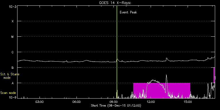 EIS Observation timeline overlay to GOES-Xray curve Code 1" 2" 40" 266" EIS Observations list for this event: STUDY ACRONYM ID DATE OBSERVED DESCRIPTION NOAA# TARGET 0 SK_CH_DIAG_320x384 | 49786 | 2015/12/08 10:35:21 | Polar monitoring campaign during the s | | Coronal Hole TIMELINE ID DATE OBSERVED FITS FILE XCEN (+W/-E) YCEN (+N/-S) DUR ----------------------------------------------------------------------------------------------------------------- 49786 | 2015/12/08 10:35:21.000 | eis_l0_20151208_103521.fits.gz | -15.57 | -924.61 | 4h35m37s 1 regcal071 | 49787 | 2015/12/08 17:05:42 | Dark exposures, CCD bottom rows (100s | | Engineering TIMELINE ID DATE OBSERVED FITS FILE XCEN (+W/-E) YCEN (+N/-S) DUR ----------------------------------------------------------------------------------------------------------------- 49787 | 2015/12/08 17:05:42.000 | eis_l0_20151208_170542.fits.gz | -1.25 | -1229.54 | 3m21s : Check study information : Download file : View thumbnails For this event, also check for: