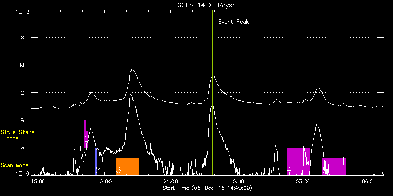 EIS Observation timeline overlay to GOES-Xray curve Code 1" 2" 40" 266" EIS Observations list for this event: STUDY ACRONYM ID DATE OBSERVED DESCRIPTION NOAA# TARGET 0 regcal071 | 49787 | 2015/12/08 17:05:42 | Dark exposures, CCD bottom rows (100s | | Engineering TIMELINE ID DATE OBSERVED FITS FILE XCEN (+W/-E) YCEN (+N/-S) DUR ----------------------------------------------------------------------------------------------------------------- 49787 | 2015/12/08 17:05:42.000 | eis_l0_20151208_170542.fits.gz | -1.25 | -1229.54 | 3m21s 1 regcal072 | 49788 | 2015/12/08 17:09:30 | Dark exposures, top CCD rows (100s exp | | Engineering TIMELINE ID DATE OBSERVED FITS FILE XCEN (+W/-E) YCEN (+N/-S) DUR ----------------------------------------------------------------------------------------------------------------- 49788 | 2015/12/08 17:09:30.000 | eis_l0_20151208_170930.fits.gz | -1.25 | -718.54 | 3m22s 2 PRY_slot_context_v3 | 49802 | 2015/12/08 17:35:34 | EIS spectral atlas synoptic programme | | Active Region TIMELINE ID DATE OBSERVED FITS FILE XCEN (+W/-E) YCEN (+N/-S) DUR ----------------------------------------------------------------------------------------------------------------- 49802 | 2015/12/08 17:35:34.000 | eis_l0_20151208_173534.fits.gz | 738.65 | -22.59 | 2m56s 3 Atlas_60 | 49803 | 2015/12/08 18:31:33 | EIS spectral atlas synoptic programme | | Quiet Sun TIMELINE ID DATE OBSERVED FITS FILE XCEN (+W/-E) YCEN (+N/-S) DUR ----------------------------------------------------------------------------------------------------------------- 49803 | 2015/12/08 18:31:33.000 | eis_l0_20151208_183133.fits.gz | 759.03 | -22.67 | 1h1m40s 4 HPW021_VEL_120x512v1 | 49807 | 2015/12/09 02:15:26 | Active region studies | 2465 | Active Region TIMELINE ID DATE OBSERVED FITS FILE XCEN (+W/-E) YCEN (+N/-S) DUR ----------------------------------------------------------------------------------------------------------------- 49807 | 2015/12/09 02:15:26.000 | eis_l0_20151209_021526.fits.gz | -798.84 | -103.87 | 1h1m54s 5 HPW021_VEL_120x512v1 | 49814 | 2015/12/09 03:53:13 | Active region studies | 2465 | Active Region TIMELINE ID DATE OBSERVED FITS FILE XCEN (+W/-E) YCEN (+N/-S) DUR ----------------------------------------------------------------------------------------------------------------- 49814 | 2015/12/09 03:53:13.000 | eis_l0_20151209_035313.fits.gz | -789.57 | -103.79 | 1h1m53s : Check study information : Download file : View thumbnails For this event, also check for: