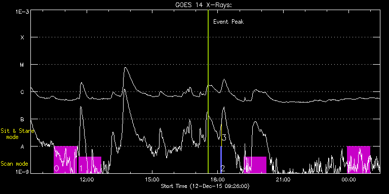 EIS Observation timeline overlay to GOES-Xray curve Code 1" 2" 40" 266" EIS Observations list for this event: STUDY ACRONYM ID DATE OBSERVED DESCRIPTION NOAA# TARGET 0 HPW021_VEL_120x512v1 | 49793 | 2015/12/12 10:30:38 | Active region studies | 2465 | Active Region TIMELINE ID DATE OBSERVED FITS FILE XCEN (+W/-E) YCEN (+N/-S) DUR ----------------------------------------------------------------------------------------------------------------- 49793 | 2015/12/12 10:30:38.000 | eis_l0_20151212_103038.fits.gz | -168.66 | -96.68 | 1h1m53s 1 HPW021_VEL_120x512v1 | 49798 | 2015/12/12 11:38:11 | Active region studies | 2465 | Active Region TIMELINE ID DATE OBSERVED FITS FILE XCEN (+W/-E) YCEN (+N/-S) DUR ----------------------------------------------------------------------------------------------------------------- 49798 | 2015/12/12 11:38:11.000 | eis_l0_20151212_113811.fits.gz | -158.15 | -96.68 | 1h1m53s 2 PRY_slot_contextLITE | 49780 | 2015/12/12 18:07:32 | Change of EIS pointing and alignment w | 2464 | Active Region TIMELINE ID DATE OBSERVED FITS FILE XCEN (+W/-E) YCEN (+N/-S) DUR ----------------------------------------------------------------------------------------------------------------- 49780 | 2015/12/12 18:07:32.000 | eis_l0_20151212_180732.fits.gz | -15.21 | -0.42 | 2m57s 3 XRT_synop_AIA | 49781 | 2015/12/12 18:10:47 | Change of EIS pointing and alignment w | 2465 | Quiet Sun TIMELINE ID DATE OBSERVED FITS FILE XCEN (+W/-E) YCEN (+N/-S) DUR ----------------------------------------------------------------------------------------------------------------- 49781 | 2015/12/12 18:10:47.000 | eis_l0_20151212_181047.fits.gz | -132.57 | -0.42 | 10s 4 HPW021_VEL_120x512v1 | 49820 | 2015/12/12 19:11:31 | Active region studies | | Active Region TIMELINE ID DATE OBSERVED FITS FILE XCEN (+W/-E) YCEN (+N/-S) DUR ----------------------------------------------------------------------------------------------------------------- 49820 | 2015/12/12 19:11:31.000 | eis_l0_20151212_191131.fits.gz | -87.39 | -95.91 | 1h1m53s 5 HPW021_VEL_120x512v1 | 49811 | 2015/12/12 23:55:38 | Active region studies | | Active Region TIMELINE ID DATE OBSERVED FITS FILE XCEN (+W/-E) YCEN (+N/-S) DUR ----------------------------------------------------------------------------------------------------------------- 49811 | 2015/12/12 23:55:38.000 | eis_l0_20151212_235538.fits.gz | -42.74 | -95.45 | 1h1m53s : Check study information : Download file : View thumbnails For this event, also check for: