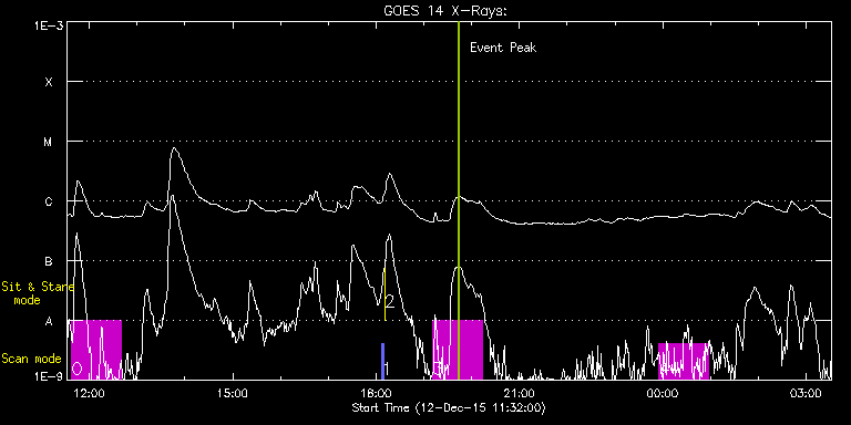 EIS Observation timeline overlay to GOES-Xray curve Code 1" 2" 40" 266" EIS Observations list for this event: STUDY ACRONYM ID DATE OBSERVED DESCRIPTION NOAA# TARGET 0 HPW021_VEL_120x512v1 | 49798 | 2015/12/12 11:38:11 | Active region studies | 2465 | Active Region TIMELINE ID DATE OBSERVED FITS FILE XCEN (+W/-E) YCEN (+N/-S) DUR ----------------------------------------------------------------------------------------------------------------- 49798 | 2015/12/12 11:38:11.000 | eis_l0_20151212_113811.fits.gz | -158.15 | -96.68 | 1h1m53s 1 PRY_slot_contextLITE | 49780 | 2015/12/12 18:07:32 | Change of EIS pointing and alignment w | 2464 | Active Region TIMELINE ID DATE OBSERVED FITS FILE XCEN (+W/-E) YCEN (+N/-S) DUR ----------------------------------------------------------------------------------------------------------------- 49780 | 2015/12/12 18:07:32.000 | eis_l0_20151212_180732.fits.gz | -15.21 | -0.42 | 2m57s 2 XRT_synop_AIA | 49781 | 2015/12/12 18:10:47 | Change of EIS pointing and alignment w | 2465 | Quiet Sun TIMELINE ID DATE OBSERVED FITS FILE XCEN (+W/-E) YCEN (+N/-S) DUR ----------------------------------------------------------------------------------------------------------------- 49781 | 2015/12/12 18:10:47.000 | eis_l0_20151212_181047.fits.gz | -132.57 | -0.42 | 10s 3 HPW021_VEL_120x512v1 | 49820 | 2015/12/12 19:11:31 | Active region studies | | Active Region TIMELINE ID DATE OBSERVED FITS FILE XCEN (+W/-E) YCEN (+N/-S) DUR ----------------------------------------------------------------------------------------------------------------- 49820 | 2015/12/12 19:11:31.000 | eis_l0_20151212_191131.fits.gz | -87.39 | -95.91 | 1h1m53s 4 HPW021_VEL_120x512v1 | 49811 | 2015/12/12 23:55:38 | Active region studies | | Active Region TIMELINE ID DATE OBSERVED FITS FILE XCEN (+W/-E) YCEN (+N/-S) DUR ----------------------------------------------------------------------------------------------------------------- 49811 | 2015/12/12 23:55:38.000 | eis_l0_20151212_235538.fits.gz | -42.74 | -95.45 | 1h1m53s : Check study information : Download file : View thumbnails For this event, also check for:
