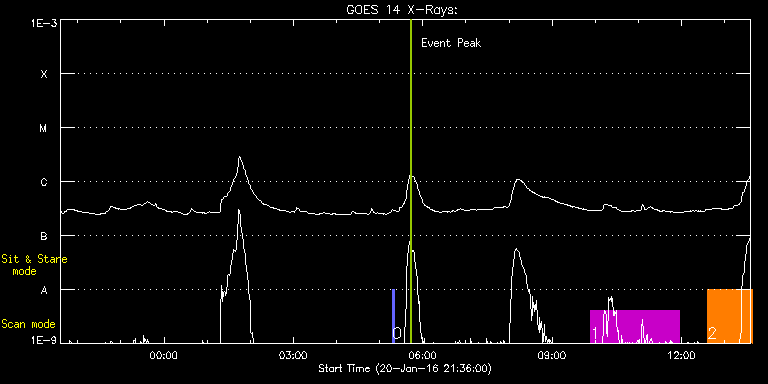 EIS Observation timeline overlay to GOES-Xray curve Code 1" 2" 40" 266" EIS Observations list for this event: STUDY ACRONYM ID DATE OBSERVED DESCRIPTION NOAA# TARGET 0 PRY_slot_context_v3 | 50442 | 2016/01/21 05:17:52 | AR filament obs. | 2486 | Active Region TIMELINE ID DATE OBSERVED FITS FILE XCEN (+W/-E) YCEN (+N/-S) DUR ----------------------------------------------------------------------------------------------------------------- 50442 | 2016/01/21 05:17:52.000 | eis_l0_20160121_051752.fits.gz | -530.31 | -301.30 | 2m57s 1 HPW021VEL240x512v1_b | 50427 | 2016/01/21 09:53:47 | AR 12486 obs. | 2486 | Active Region TIMELINE ID DATE OBSERVED FITS FILE XCEN (+W/-E) YCEN (+N/-S) DUR ----------------------------------------------------------------------------------------------------------------- 50427 | 2016/01/21 09:53:47.000 | eis_l0_20160121_095347.fits.gz | -530.03 | -89.75 | 2h3m48s 2 Atlas_60 | 50426 | 2016/01/21 12:36:26 | atlas obs for AR 12486 | 2487 | Quiet Sun TIMELINE ID DATE OBSERVED FITS FILE XCEN (+W/-E) YCEN (+N/-S) DUR ----------------------------------------------------------------------------------------------------------------- 50426 | 2016/01/21 12:36:26.000 | eis_l0_20160121_123626.fits.gz | -539.21 | -168.51 | 1h1m40s : Check study information : Download file : View thumbnails For this event, also check for: