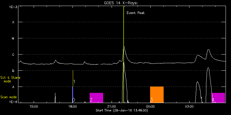 EIS Observation timeline overlay to GOES-Xray curve Code 1" 2" 40" 266" EIS Observations list for this event: STUDY ACRONYM ID DATE OBSERVED DESCRIPTION NOAA# TARGET 0 PRY_slot_contextLITE | 50460 | 2016/01/28 17:58:19 | Pointing monitoring | | Active Region TIMELINE ID DATE OBSERVED FITS FILE XCEN (+W/-E) YCEN (+N/-S) DUR ----------------------------------------------------------------------------------------------------------------- 50460 | 2016/01/28 17:58:19.000 | eis_l0_20160128_175819.fits.gz | -15.29 | -0.58 | 2m56s 1 XRT_synop_AIA | 50461 | 2016/01/28 18:01:33 | Pointing monitoring | | Quiet Sun TIMELINE ID DATE OBSERVED FITS FILE XCEN (+W/-E) YCEN (+N/-S) DUR ----------------------------------------------------------------------------------------------------------------- 50461 | 2016/01/28 18:01:33.000 | eis_l0_20160128_180133.fits.gz | -132.64 | -0.58 | 10s 2 HPW021VEL120x512v1_b | 50486 | 2016/01/28 19:18:32 | AR12488 observation | | Active Region TIMELINE ID DATE OBSERVED FITS FILE XCEN (+W/-E) YCEN (+N/-S) DUR ----------------------------------------------------------------------------------------------------------------- 50486 | 2016/01/28 19:18:32.000 | eis_l0_20160128_191832.fits.gz | 730.66 | 30.00 | 1h1m52s 3 Atlas_60 | 50487 | 2016/01/28 23:58:25 | AR12488 observation | | Quiet Sun TIMELINE ID DATE OBSERVED FITS FILE XCEN (+W/-E) YCEN (+N/-S) DUR ----------------------------------------------------------------------------------------------------------------- 50487 | 2016/01/28 23:58:25.000 | eis_l0_20160128_235825.fits.gz | 762.41 | 125.68 | 1h1m39s 4 HPW021VEL120x512v1_b | 50488 | 2016/01/29 04:42:25 | AR12488 observation | 2488 | Active Region TIMELINE ID DATE OBSERVED FITS FILE XCEN (+W/-E) YCEN (+N/-S) DUR ----------------------------------------------------------------------------------------------------------------- 50488 | 2016/01/29 04:42:25.000 | eis_l0_20160129_044225.fits.gz | 786.00 | 10.05 | 1h1m52s : Check study information : Download file : View thumbnails For this event, also check for: