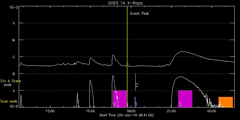 EIS Observation timeline overlay to GOES-Xray curve Code 1" 2" 40" 266" EIS Observations list for this event: STUDY ACRONYM ID DATE OBSERVED DESCRIPTION NOAA# TARGET 0 HPW021VEL120x512v1_b | 50507 | 2016/01/29 16:40:25 | AR12488 observation | 2488 | Active Region TIMELINE ID DATE OBSERVED FITS FILE XCEN (+W/-E) YCEN (+N/-S) DUR ----------------------------------------------------------------------------------------------------------------- 50507 | 2016/01/29 16:40:25.000 | eis_l0_20160129_164025.fits.gz | 847.52 | 12.47 | 1h1m52s 1 PRY_slot_contextLITE | 50462 | 2016/01/29 18:16:31 | Pointing monitoring | | Active Region TIMELINE ID DATE OBSERVED FITS FILE XCEN (+W/-E) YCEN (+N/-S) DUR ----------------------------------------------------------------------------------------------------------------- 50462 | 2016/01/29 18:16:31.000 | eis_l0_20160129_181631.fits.gz | -15.29 | -0.50 | 2m57s 2 XRT_synop_AIA | 50463 | 2016/01/29 18:19:45 | Pointing monitoring | 2489 | Quiet Sun TIMELINE ID DATE OBSERVED FITS FILE XCEN (+W/-E) YCEN (+N/-S) DUR ----------------------------------------------------------------------------------------------------------------- 50463 | 2016/01/29 18:19:45.000 | eis_l0_20160129_181945.fits.gz | -132.49 | -0.58 | 10s 3 HPW021VEL120x512v1_b | 50490 | 2016/01/29 21:30:31 | AR12488 observation | | Active Region TIMELINE ID DATE OBSERVED FITS FILE XCEN (+W/-E) YCEN (+N/-S) DUR ----------------------------------------------------------------------------------------------------------------- 50490 | 2016/01/29 21:30:31.000 | eis_l0_20160129_213031.fits.gz | 865.85 | 5.38 | 1h1m53s 4 Atlas_60 | 50491 | 2016/01/30 00:30:25 | AR12488 observation | 2488 | Quiet Sun TIMELINE ID DATE OBSERVED FITS FILE XCEN (+W/-E) YCEN (+N/-S) DUR ----------------------------------------------------------------------------------------------------------------- 50491 | 2016/01/30 00:30:25.000 | eis_l0_20160130_003025.fits.gz | 876.66 | 108.67 | 1h1m39s : Check study information : Download file : View thumbnails For this event, also check for: