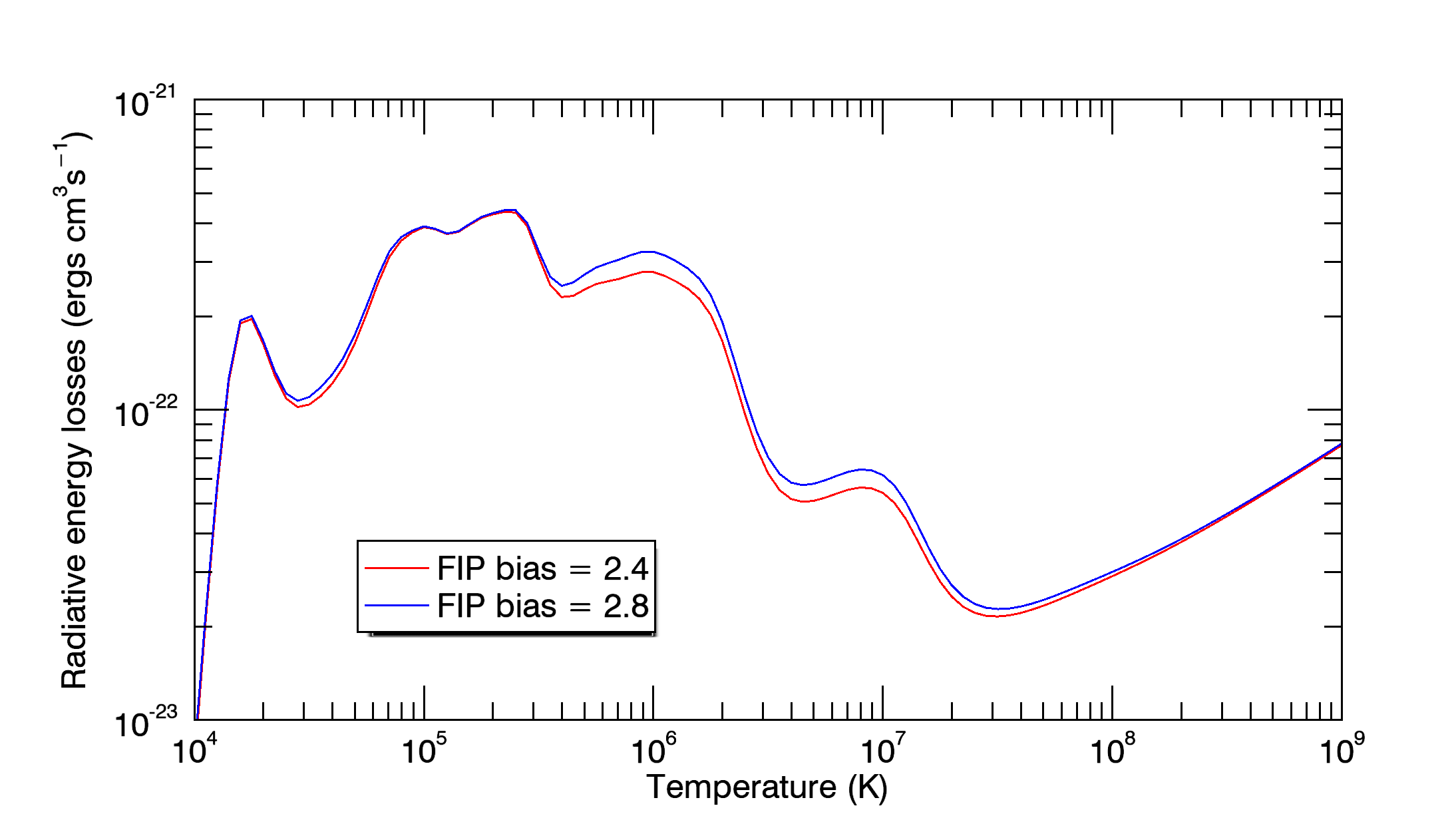 Radiative energy losses, Q(T,Ne), as a function of electron temperature in the case of plasma with FIP bias = 2.4 (red) and FIP bias = 2.8 (blue), assuming the default CHIANTI ionisation file and an electron density of 1010 cm-3.