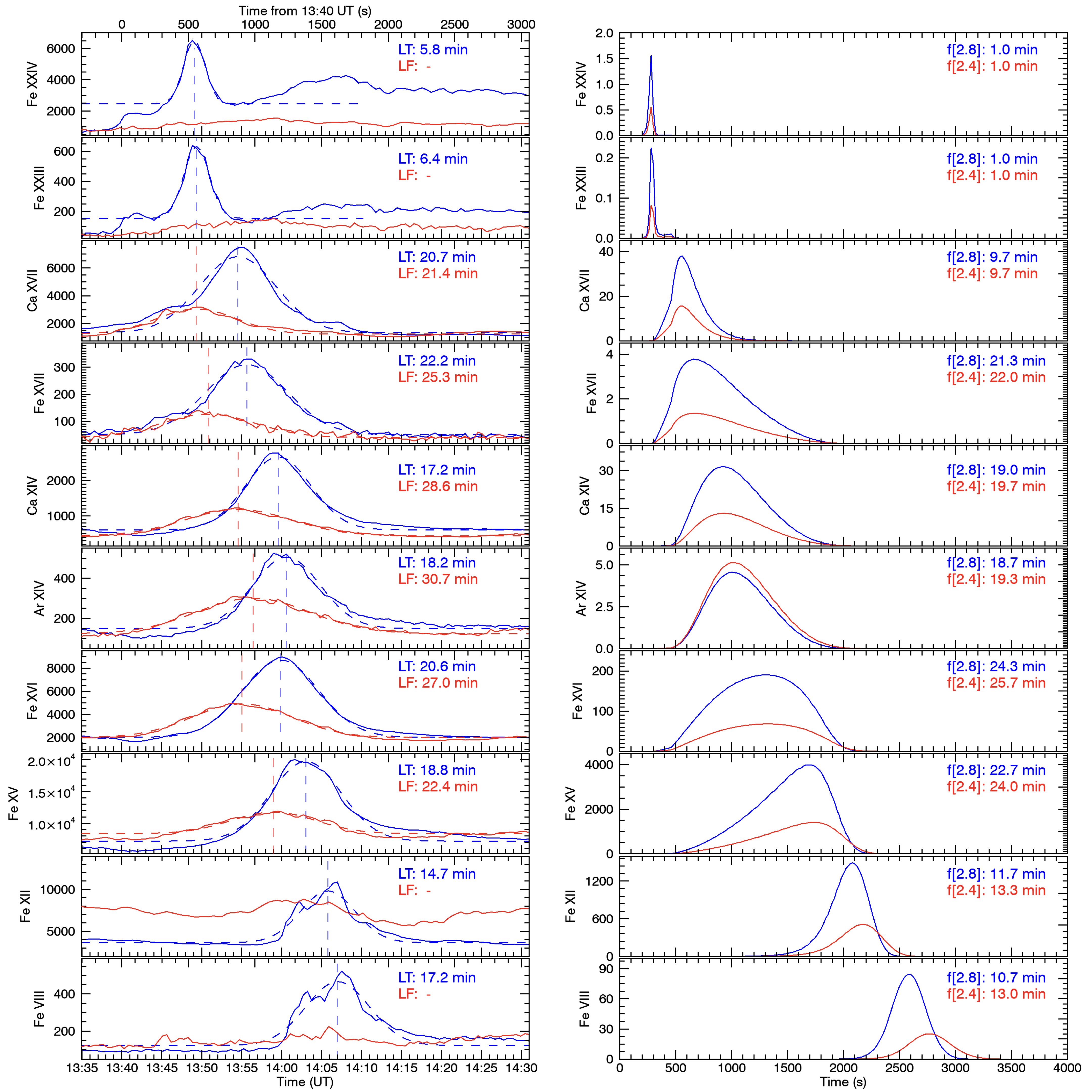 Figure 4: Intensity evolution comparison between observations and simulations. Left: Averaged Hinode EIS spectra intensity evolution in the loop top (blue) and footpoint (red). The peak emission times for each feature in each line are indicated by the vertical dashed lines. Right: Synthetic intensity evolution computed using an EBTEL simulation of a heating event in a single loop strand, assuming a plasma with a FIP bias = 2.8 (blue) and a FIP bias = 2.4 (red) respectively. Lifetimes are indicated in the top right corner of each plot.