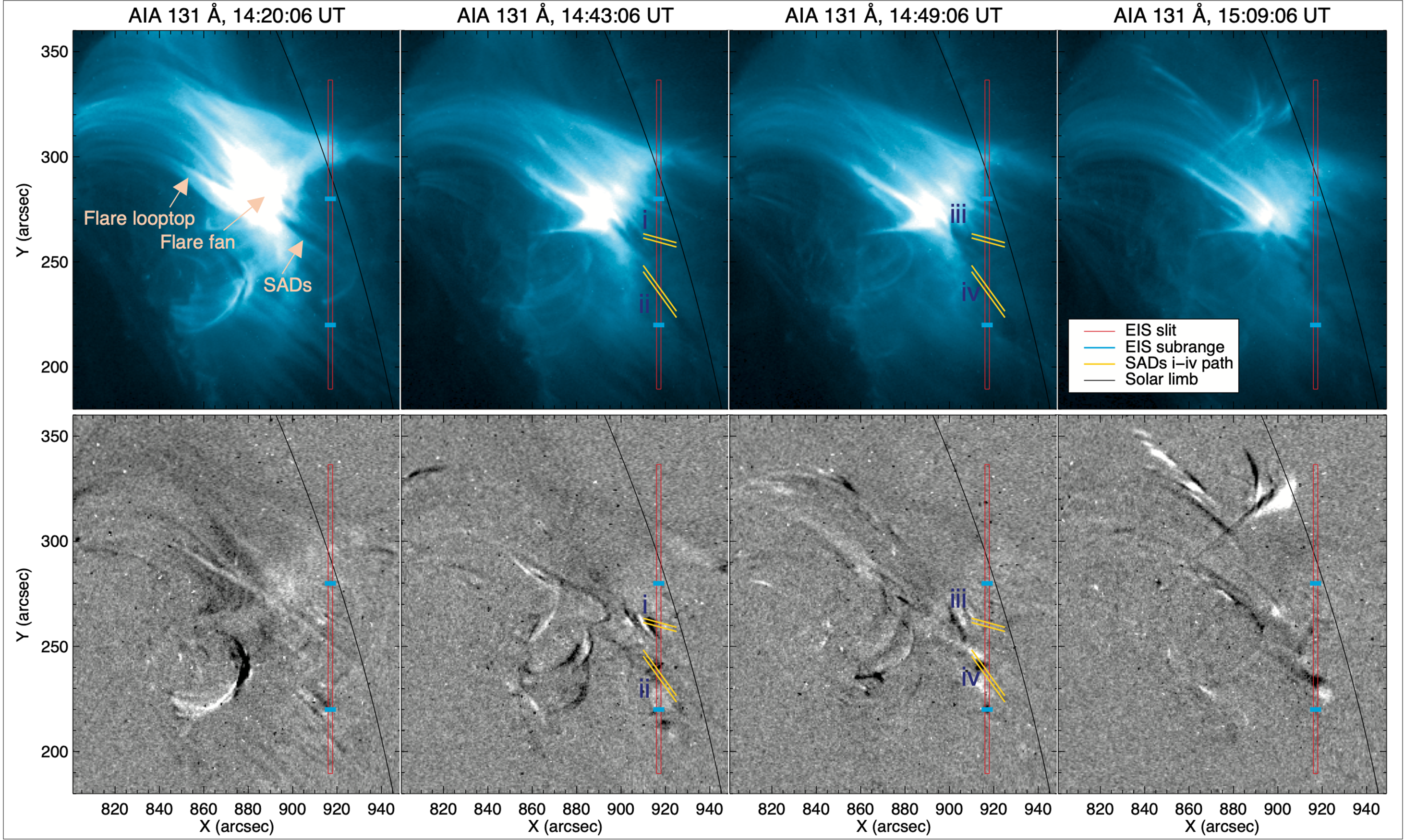 On 2022 April 2, EIS observed an M3.9-class solar flare toward the northwestern limb with a sit-and-stare sequence. Figure 1 highlights the location of the EIS sit-and-stare slit relative to the flare and solar limb, overplotted on AIA 131 Å snapshots of the flare evolution. EIS captured the full duration of the flare, including a filament eruption, late flare loop growth, and a hot supra-arcade fan. Dark streaks are visible within the flare fan, stretching from the center-right of the brightest part of each image, toward the lower-right (marked in the figure). Some of these darker structures are static, but some are dynamic-the latter of which are SADs. The second row of Figure 1 presents difference imaging (over a 1 minute running base) of the panels above. In these panels, the dynamic SADs appear black, representing the decrease in intensity created by the downflowing structures. At several times, and in multiple locations, dark SADs (seen clearly in the difference imaging panels) cross the location of the EIS slit.